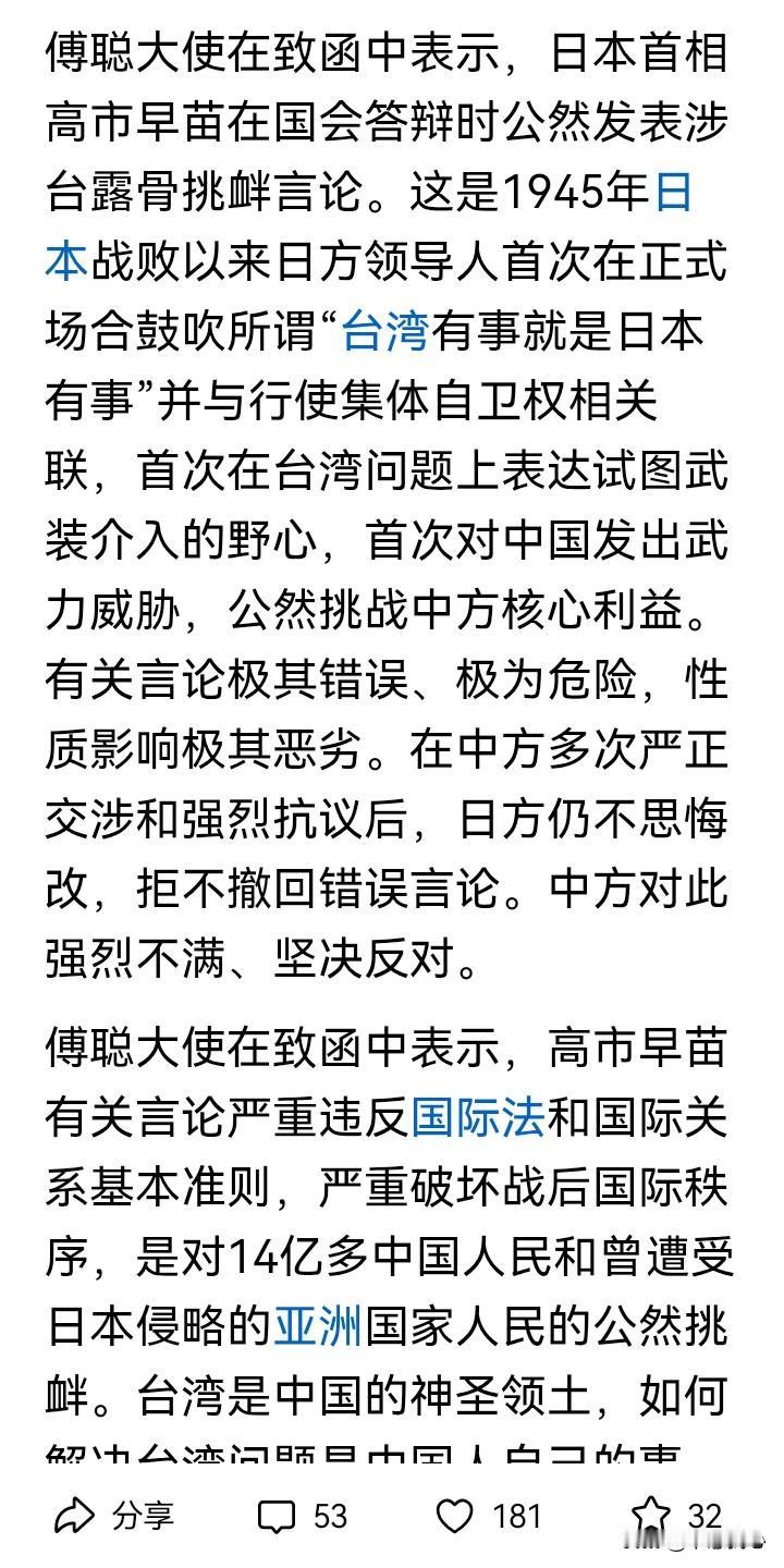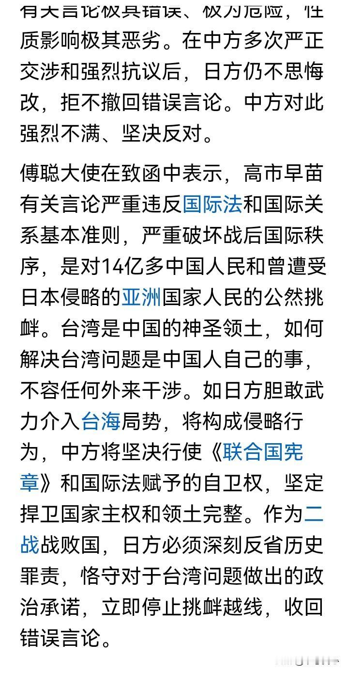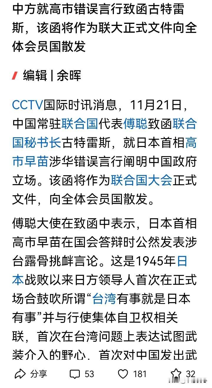 我们中国讲究先礼后兵,而且出师有名。 日本首相高市早苗在国会答辩时,公然发表涉台露骨挑衅言论,做为二战战败国,却胆敢对中国发出武力威胁!事情经过这段时间的发酵后,日方并没有反省,还要在错误的道路上越走越远,越发越线挑衅! 是可忍,孰不可忍!我们的傅聪代表致函联合国秘书长,这个函件还将做为联大正式文件,向全体会员国散发。 这是在国际外交舞台上揭发日本要挑战二战后国际秩序的严重错误,一方面是先礼后兵,二来也可以争取国际舆论支持。 假如,高市早苗敢于在12月26日“拜鬼”,那可以被认为日本要铁心和中国为敌了。 在明年2月份,我们在日本东京的两只大熊猫“晓晓”和“蕾蕾”回国后,我们很可能就以最大的力度回击高市早苗的愚蠢和狂妄了! 中方就高市错误言行致函古特雷斯 高市早苗政府将走向何方