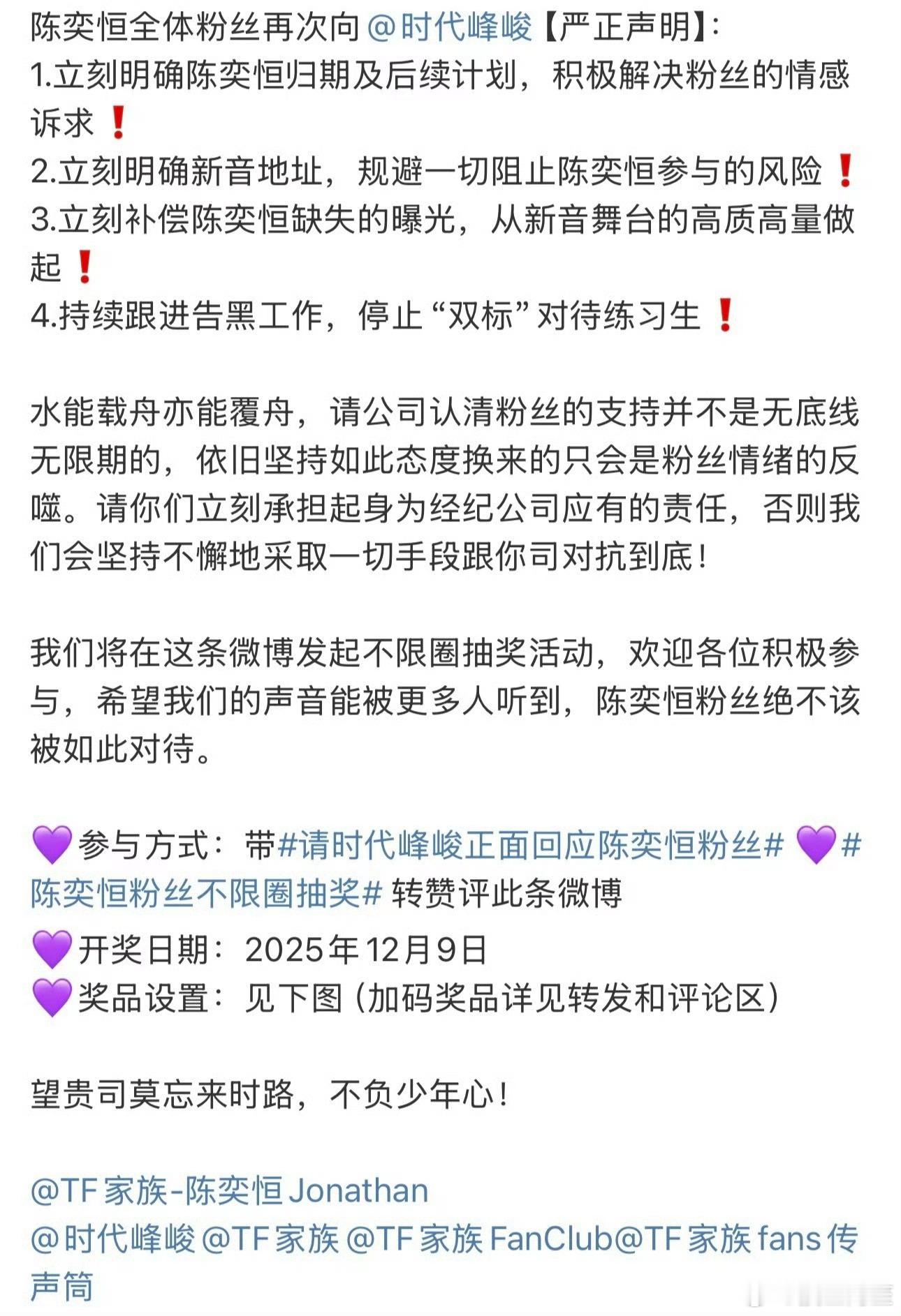 陈奕恒粉丝不限圈抽奖维⭕,要求公司时代峰峻正面回应粉丝诉求。确实啊,四代一直在集体活动准备出道了,他现在应该早点回归了。