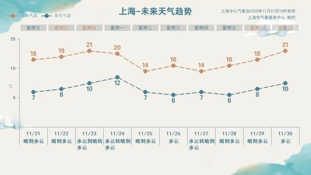 【周末冲上21℃!下周气温“过山车”,两波冷空气蓄势待发→】天气申城11月21