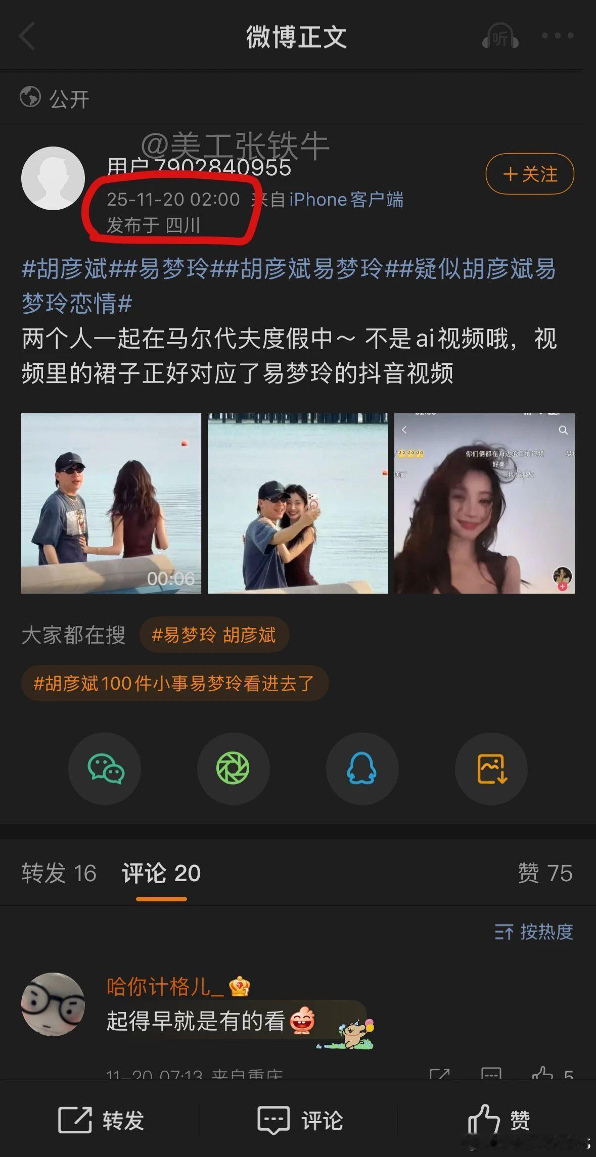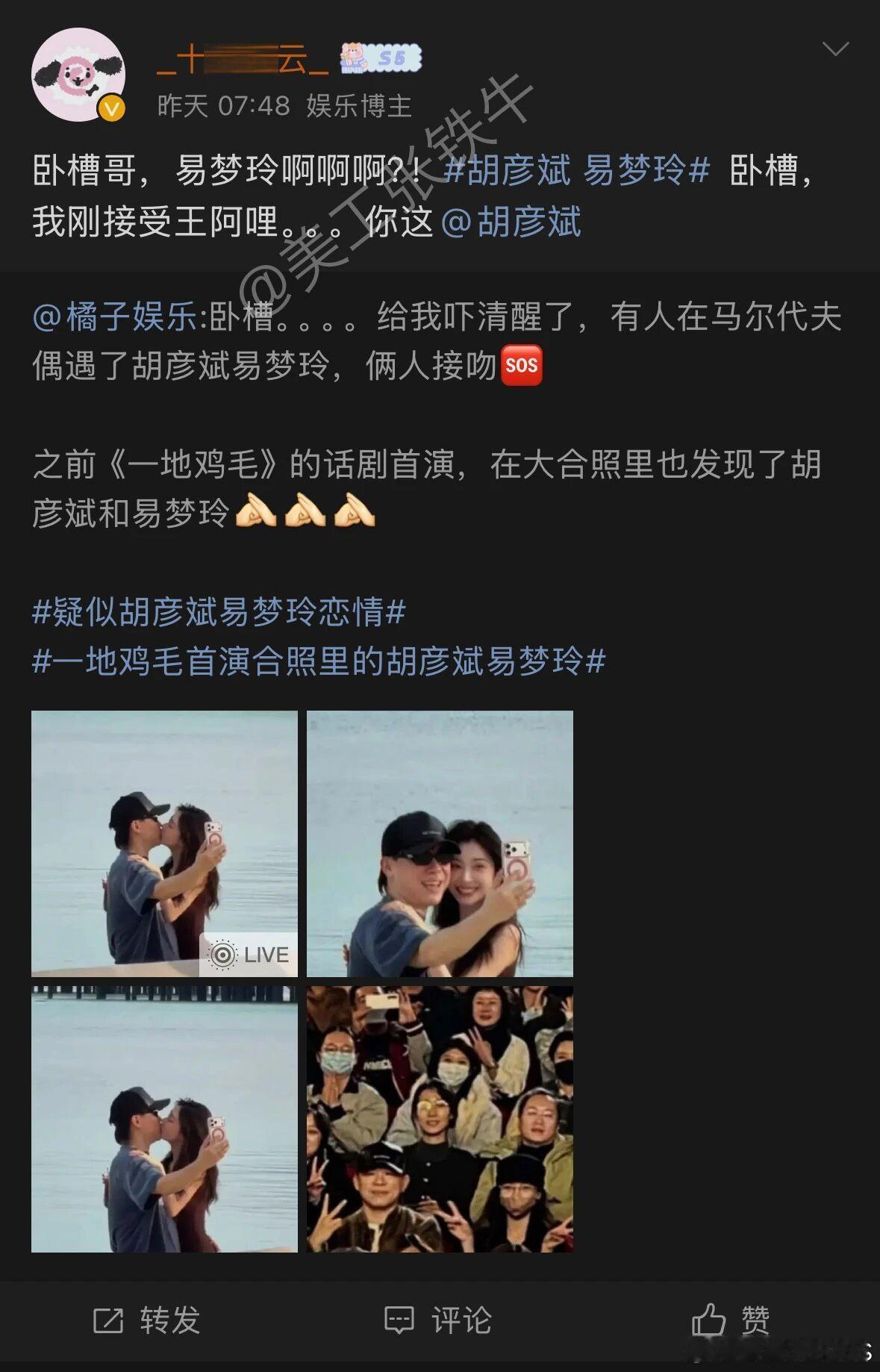 胡彦斌易梦玲这波恋情瓜真的越扒越迷!上周末胡彦斌刚去马代,老粉圈就莫名批量脱粉,当时还没人懂为啥,直到他和易梦玲的绯闻爆出来才恍然大悟。更绝的是冒出个王阿哩,老粉早知道这人跟胡彦斌关系不一般,现在三方牵扯直接乱成麻。而且这瓜明显是有人故意放的,小红书先引爆热度,微博立马甩视频实锤,从头到尾全是网红圈熟人,疑似嫂子、爆料博主再到易梦玲全是颜值网红,套路拉满,真的越品越有戏!