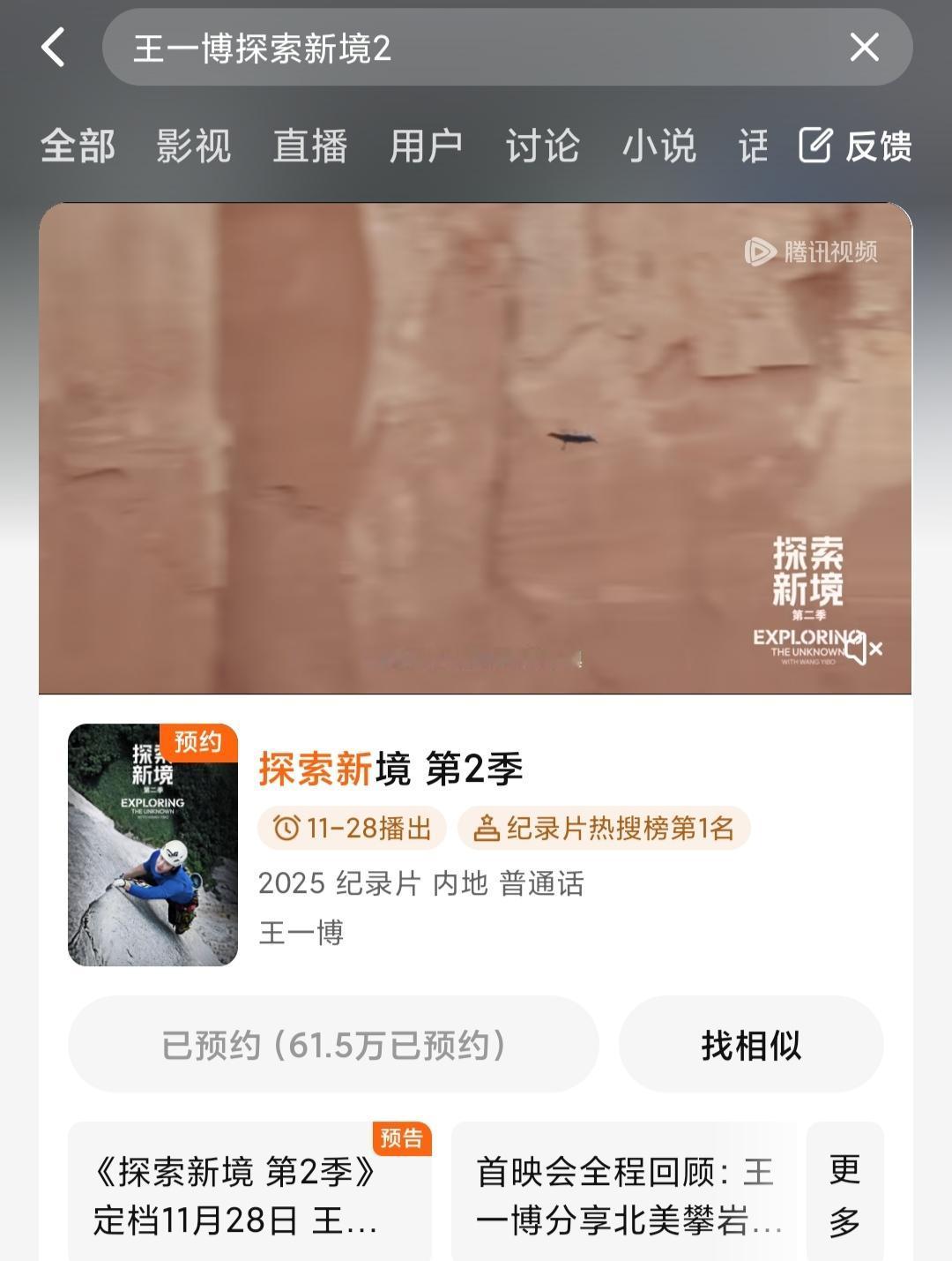 王一博《探索新境2》预约量上涨的速度惊人,从昨天下午的30万、晚上的50万,到现在已经突破61.5万!要知道,这可是纪录片啊…… 《探索新境2》预告片一出,便带着势不可挡的气势登顶热搜榜,而紧随其后的居然是已经完播的《探索新境》第一季[捂脸]只能说,王一博的这份影响力、号召力和国民关注度,真的是实打实毫不掺水的高啊。 据说,预约破百万会有“劲爆花絮”哦,加油!!! 王一博