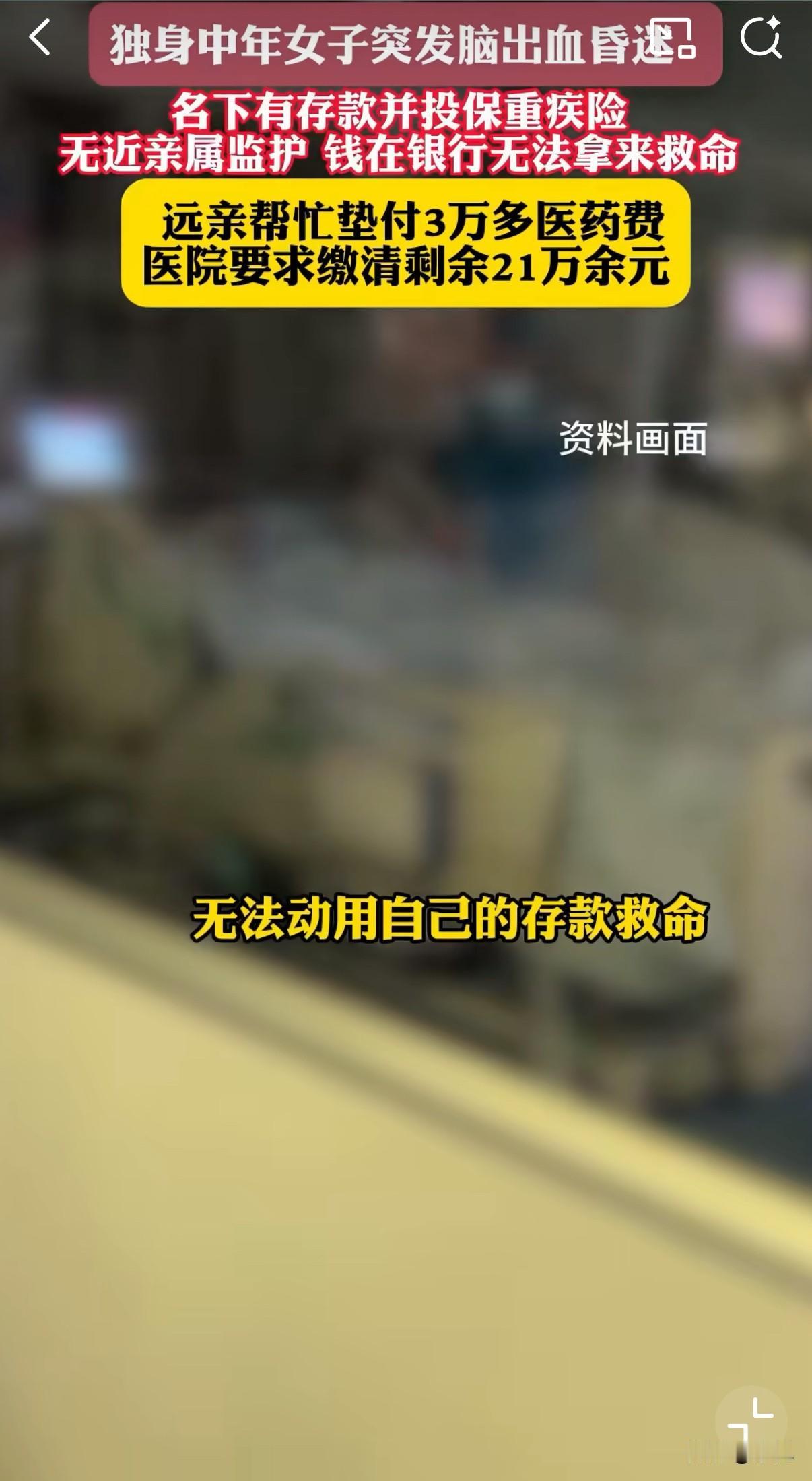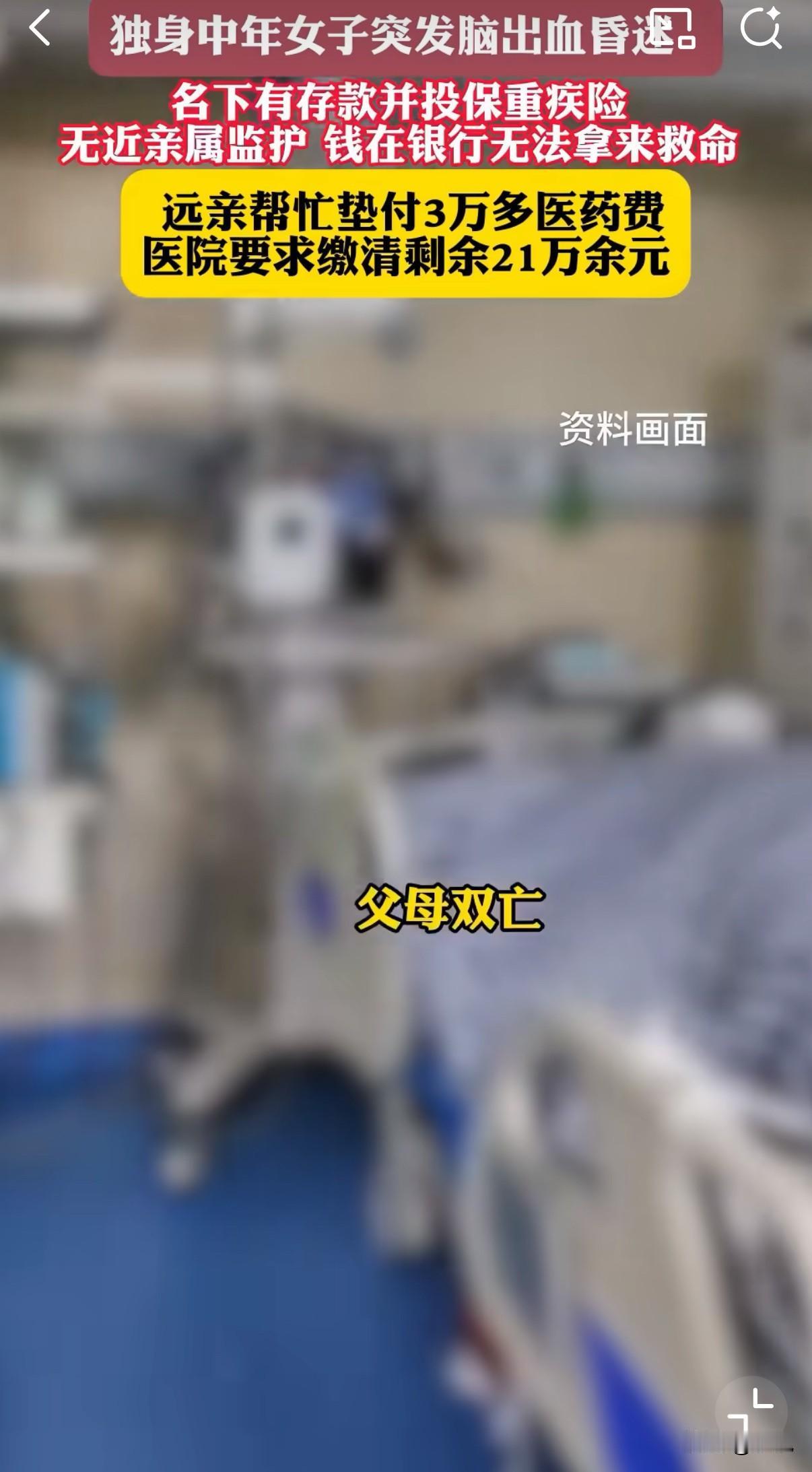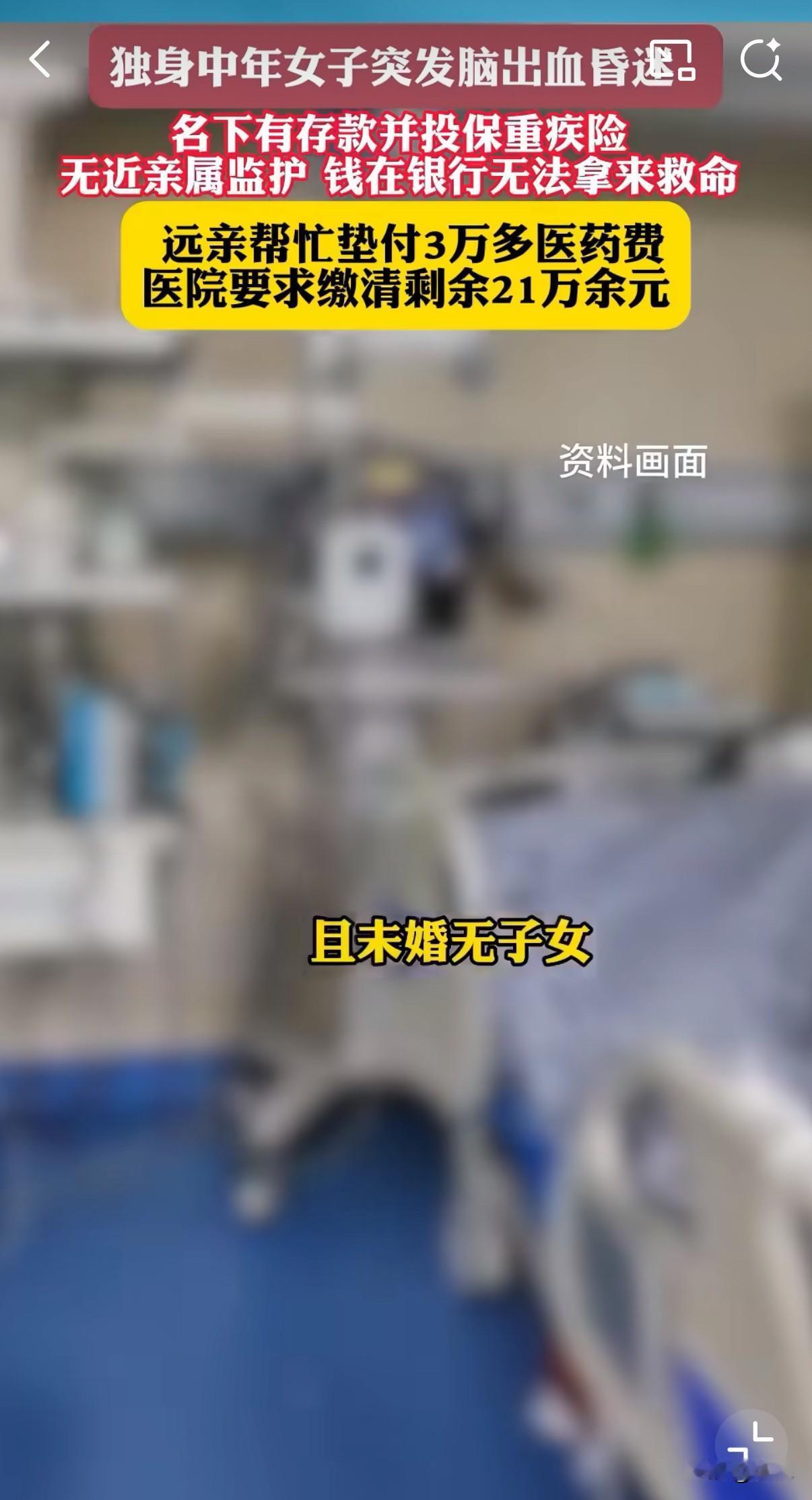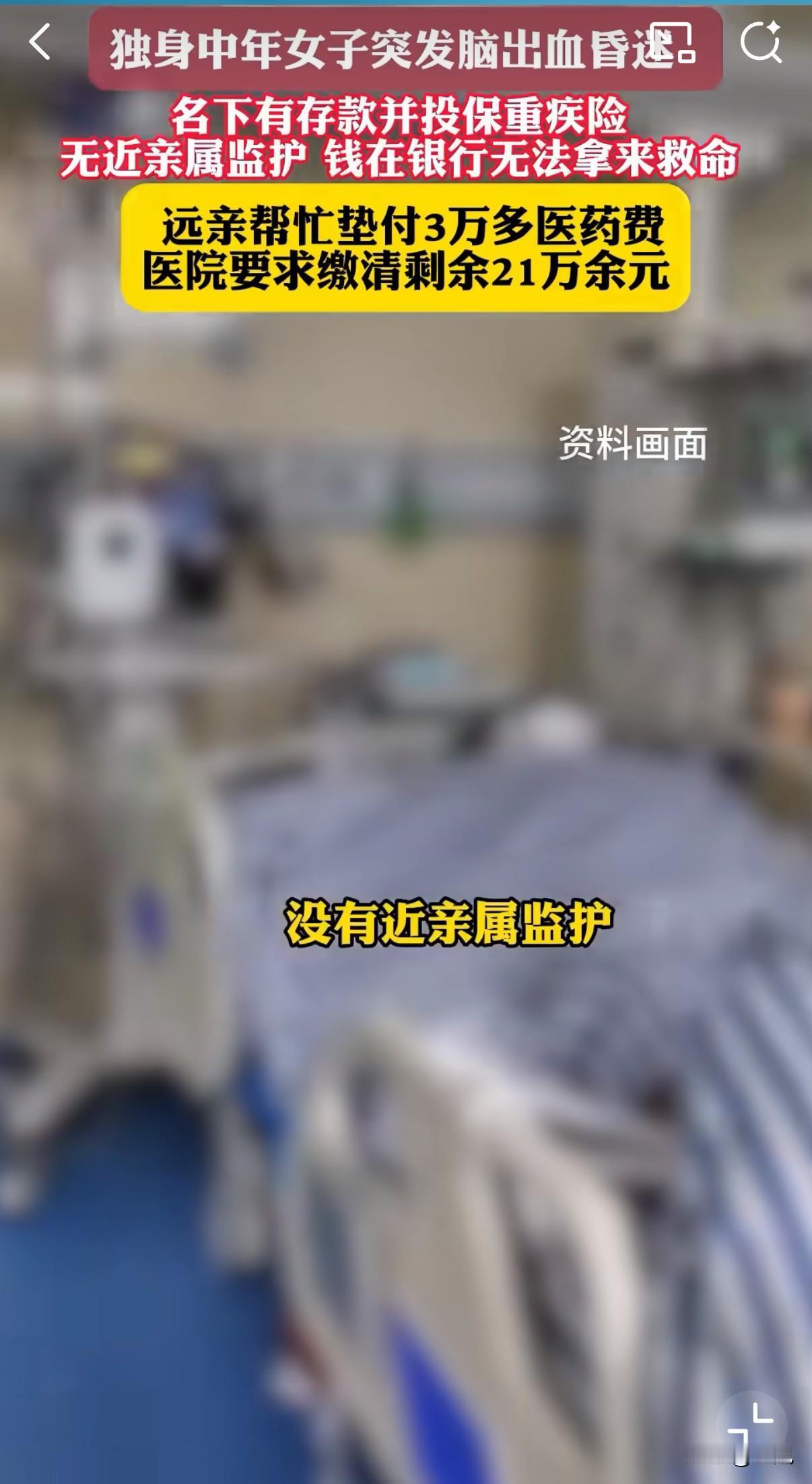独居女子脑溢血,未婚无子女,父母双亡,没有近亲监护,陷入昏迷的她,无法用自己的存款救命! 医院病房里,心电监护仪发出规律的滴答声。46岁的蒋女士躺在病床上,呼吸机有节奏地推送着空气。她的世界已经缩小到这一方病榻,而一场关于她生命的拉锯战正在病房外悄然上演。 这一切开始于一个普通的秋日。10月14日,蒋女士因突发脑出血被紧急送医。医生诊断后认为需要立即手术,但手术同意书需要家属签字。这个对大多数人来说不是问题的问题,却成了她求生路上的第一道关卡。 护士拿着手术同意书,在蒋女士意识尚清醒时询问联系人。她虚弱地报出几个电话号码,不是空号就是无人接听。最后,一个名叫吴先生的远亲接起了电话。 "我们其实不算熟,一年只见一次面,就是过年时聚个餐。"吴先生后来回忆道。他是蒋女士父亲的表姐的孙子,这段绕口的亲戚关系,在平时几乎可以忽略不计。 但就是这个平时几乎被遗忘的远亲,成了蒋女士此刻唯一的希望。吴先生接到电话后立即赶到医院,在手术同意书上签了字,还垫付了3万元医药费。 手术很顺利。所有人都以为危机已经过去。 然而,命运似乎并不打算就此放过蒋女士。术后她的病情出现反复,不得不转入重症监护室。这里的费用像开了闸的洪水,每天5000到1万元不等。 到了11月11日,医药费累计已达21万元。吴先生垫付的3万元早已用完,他面露难色:"我只是个普通工薪阶层,也有自己的家庭要养。" 这时,一个残酷的现实摆在面前:蒋女士并非没有钱。她有稳定的工作,银行卡里有存款,还购买了商业重疾险。理论上,她完全有能力支付这些医疗费用。 问题在于,她已经神志不清,无法自行操作银行转账或申请保险理赔。 因为没有法定监护人,银行和保险公司都表示爱莫能助。银行柜员礼貌而坚定地表示:"我们必须按规定办事。"保险公司的答复同样无懈可击:"理赔款只能支付给投保人本人或其法定监护人。" 于是出现了最讽刺的一幕:蒋女士的救命钱就安静地躺在账户里,与她仅隔几条街的距离,却无法动用一分一毫。 当地居委会得知情况后,决定伸出援手。邮电居民区党总支书记王镇君亲自出面协调。"居委愿意承担监护责任。"他这样承诺。 但这份善意很快在制度面前碰了壁。 银行要求开具"无其他亲属"的证明。派出所的民警无奈地表示:"我们只能开具系统中查不到其他亲属的证明,但不能保证真的没有其他亲属。" 保险公司更加直接:"居委会没有这个权利接收理赔款。" 每一个环节都在依法办事,每一道程序都无可指摘,但一个生命却在这严密的规则网中渐渐窒息。 走司法程序成为最后的选择。法院的工作人员详细解释了流程:首先要宣告蒋女士为无民事行为能力人,然后再指定监护人。 "这个过程通常需要半年左右。"工作人员补充道。 半年?ICU里的蒋女士能等半年吗?每天产生的万元账单能等半年吗? 吴先生坐在医院走廊的长椅上,双手深深插入发间。他已经做了能做的一切,但在冰冷的制度面前,个人的努力显得如此渺小。 医院账户上的欠费数字每天都在增加。医生和护士们仍然尽职尽责地救治,但每个人都明白,这样的状态不可能永远持续下去。 转折发生在第十二天。蒋女士的意识突然有了轻微恢复,虽然还仅限于能简单地张嘴。这个微小的变化,像黑暗中的一束光,给了所有人继续坚持的勇气。 与此同时,法院也在尝试加快审理速度。法官表示:"对于这种紧急情况,我们会尽可能特事特办。" 在病床上的蒋女士或许不知道,她的遭遇正在触动越来越多人的心。有网友留言:"我也是独居者,看完后背发凉。万一出事,连个能签字的人都没有。" 另一个评论写道:"我们的制度是不是应该更灵活些?在生死面前,规矩能不能通融一下?" 更令人深思的是,蒋女士的案例并非个例。随着社会结构的变化,独居人群正在不断增加。有数据显示,中国有近5800万的独居老年人,而且这个数字还在持续增长。 在医院的某个角落,吴先生正在接电话。是他的妻子询问什么时候能回家。他轻声安慰着,眼神却始终没有离开ICU的方向。 "再等等,总不能就这样放弃。"他对电话那头说。 走廊尽头,居委会的工作人员还在和保险公司沟通。虽然前路艰难,但他们没有放弃努力。 夜深了,医院的走廊安静下来。只有ICU的灯还亮着,像茫茫黑夜中的一座孤岛。在那里,蒋女士的生命之火仍在顽强地燃烧,而围绕她展开的这场关于生命与制度的拉锯战,也还在继续。 或许,这个故事最令人心痛的不是疾病本身,而是明明有救命的资源,却被无形的屏障阻隔。在这个越来越多人选择独居的时代,蒋女士的困境提醒我们:个人的未雨绸缪与制度的与时俱进,同样重要。 窗外,城市的灯火次第亮起。每一盏灯背后,都可能有一个独居的身影。他们享受独处的自由,却也承担着独处的风险。如何为这些独行者织就一张安全网,是整个社会都需要思考的课题。