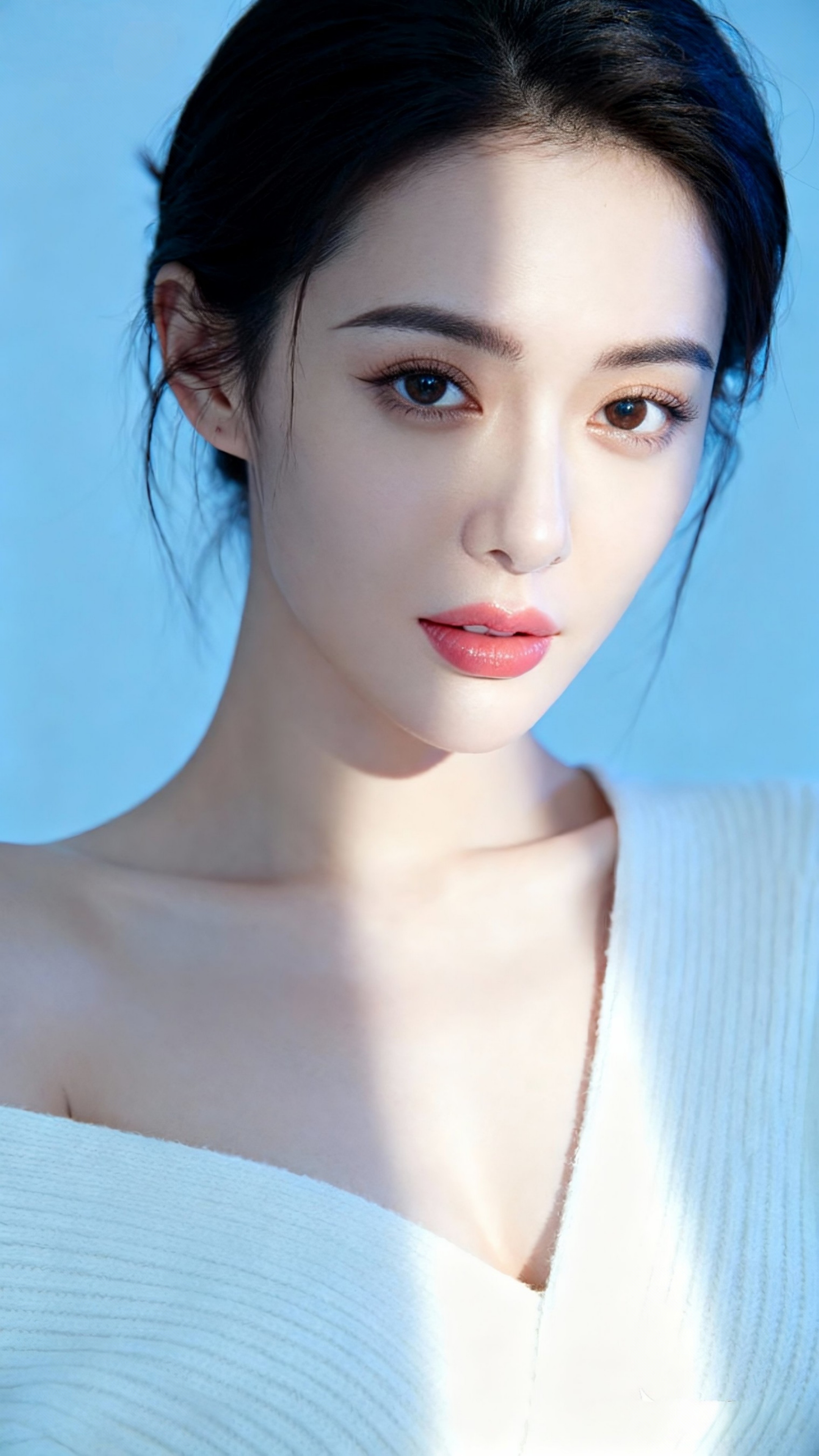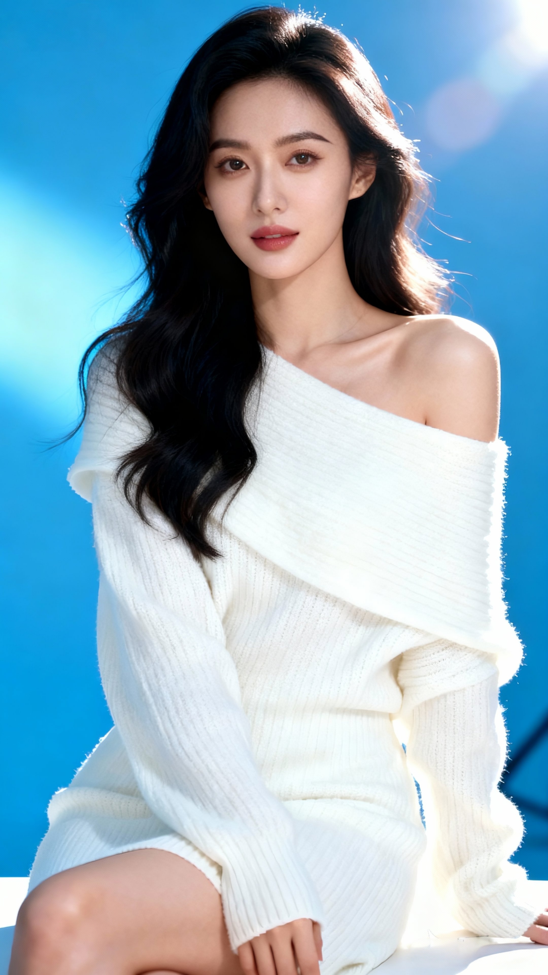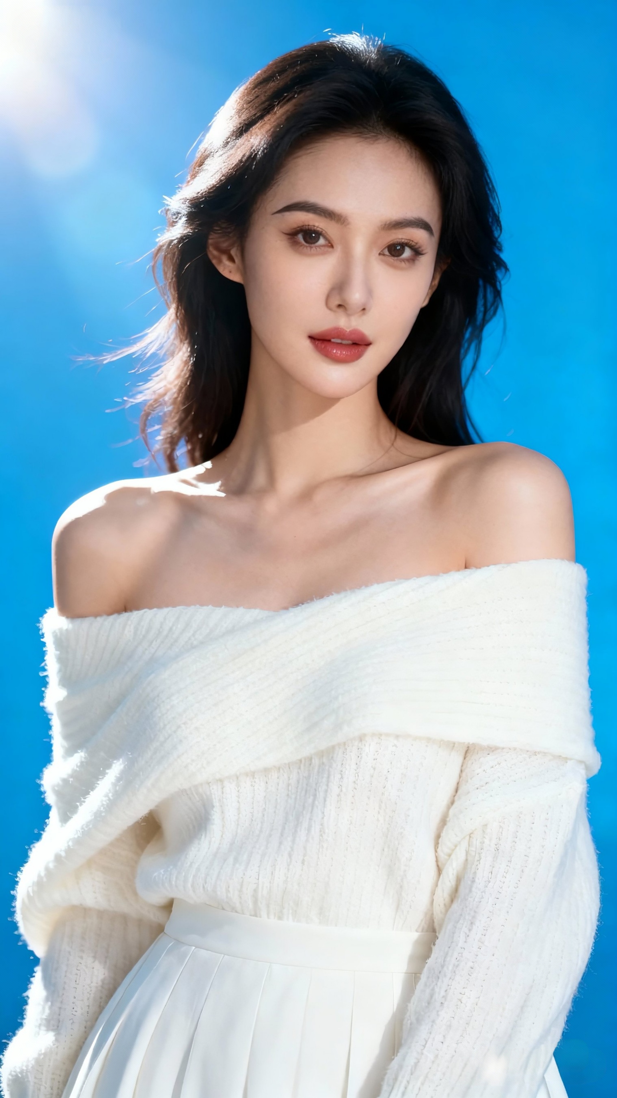 美女小姐姐,漂亮脸蛋,时尚服饰,穿白色毛衣裙,露单肩,轮廓分明,肤白貌美,高清,庄雅,画面质感佳,光线明亮,人物摄影写真。风华绝代,明艳妩媚,超高清,写真共享美人靓照
