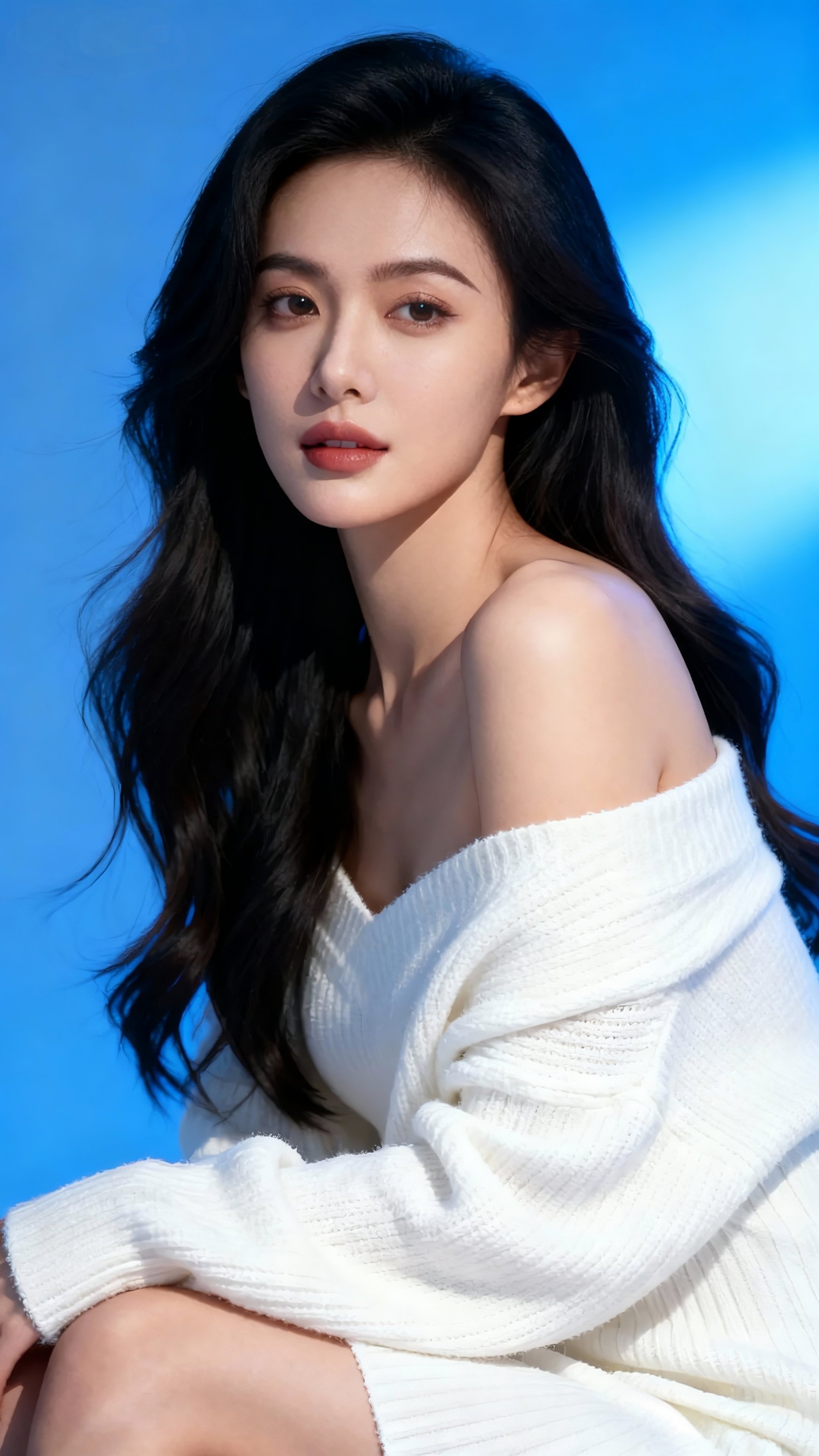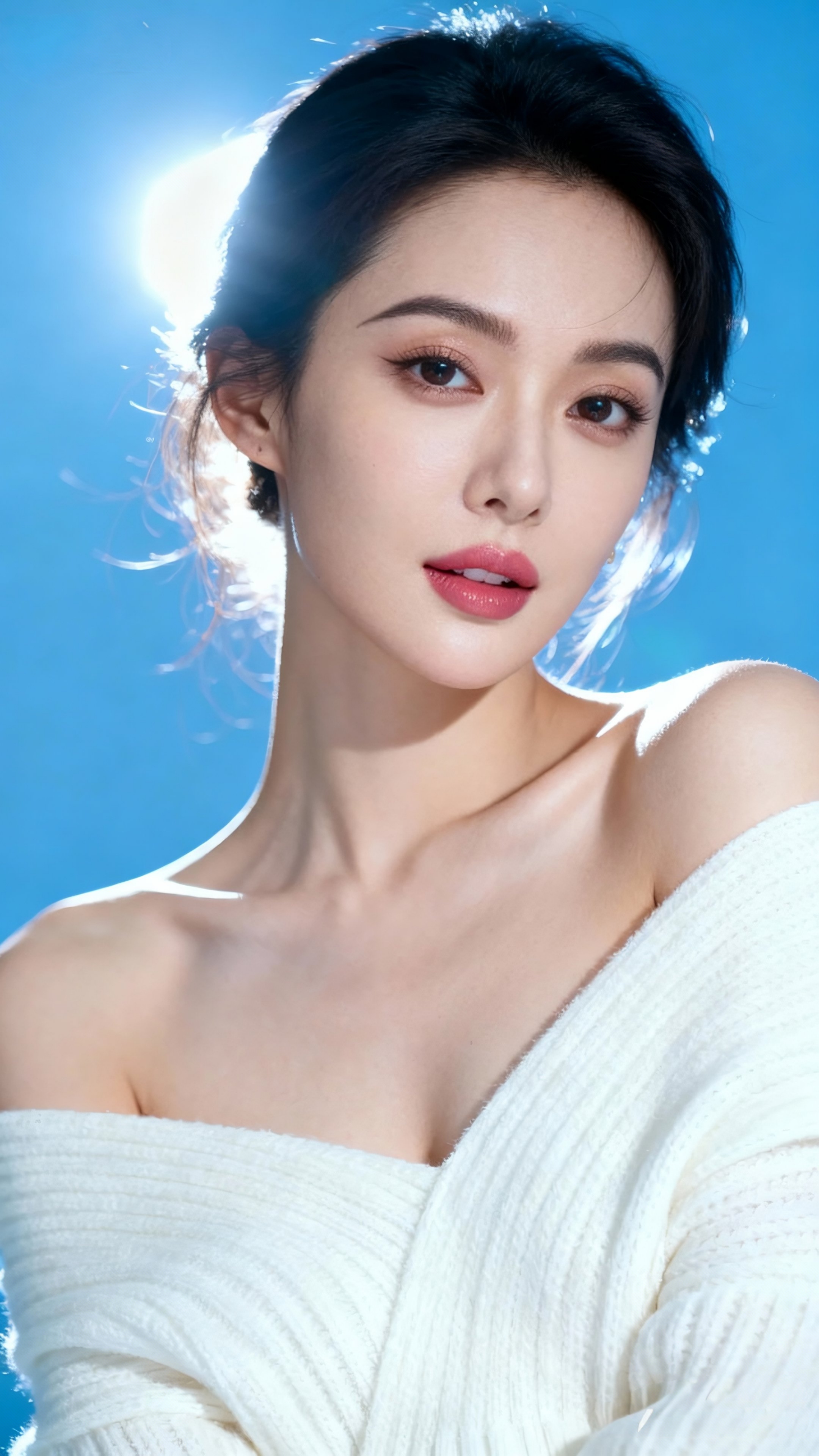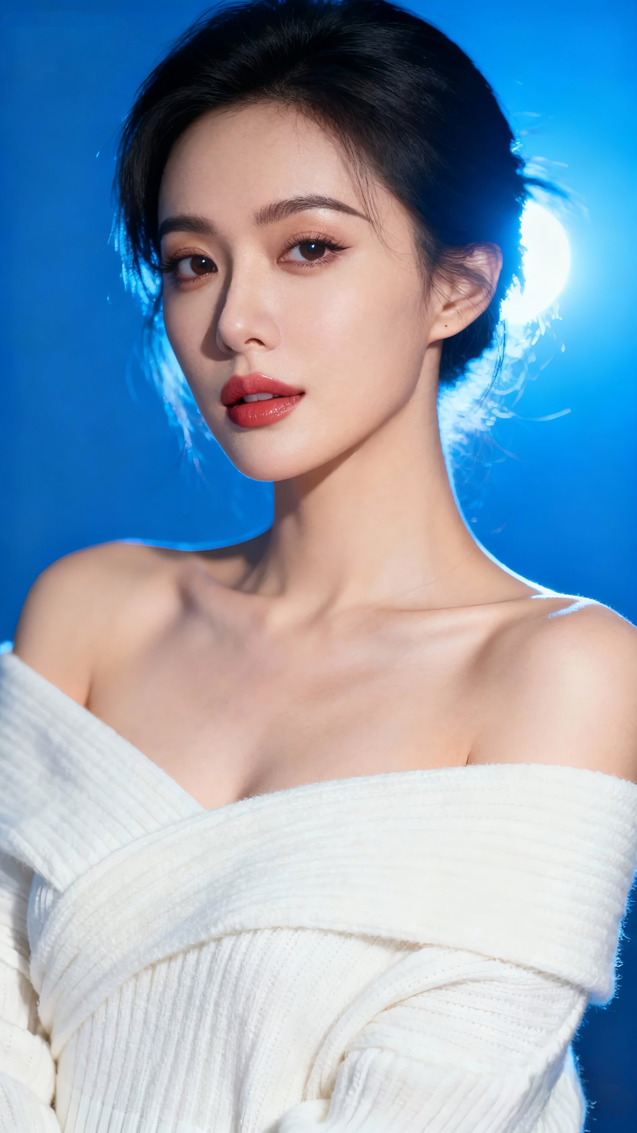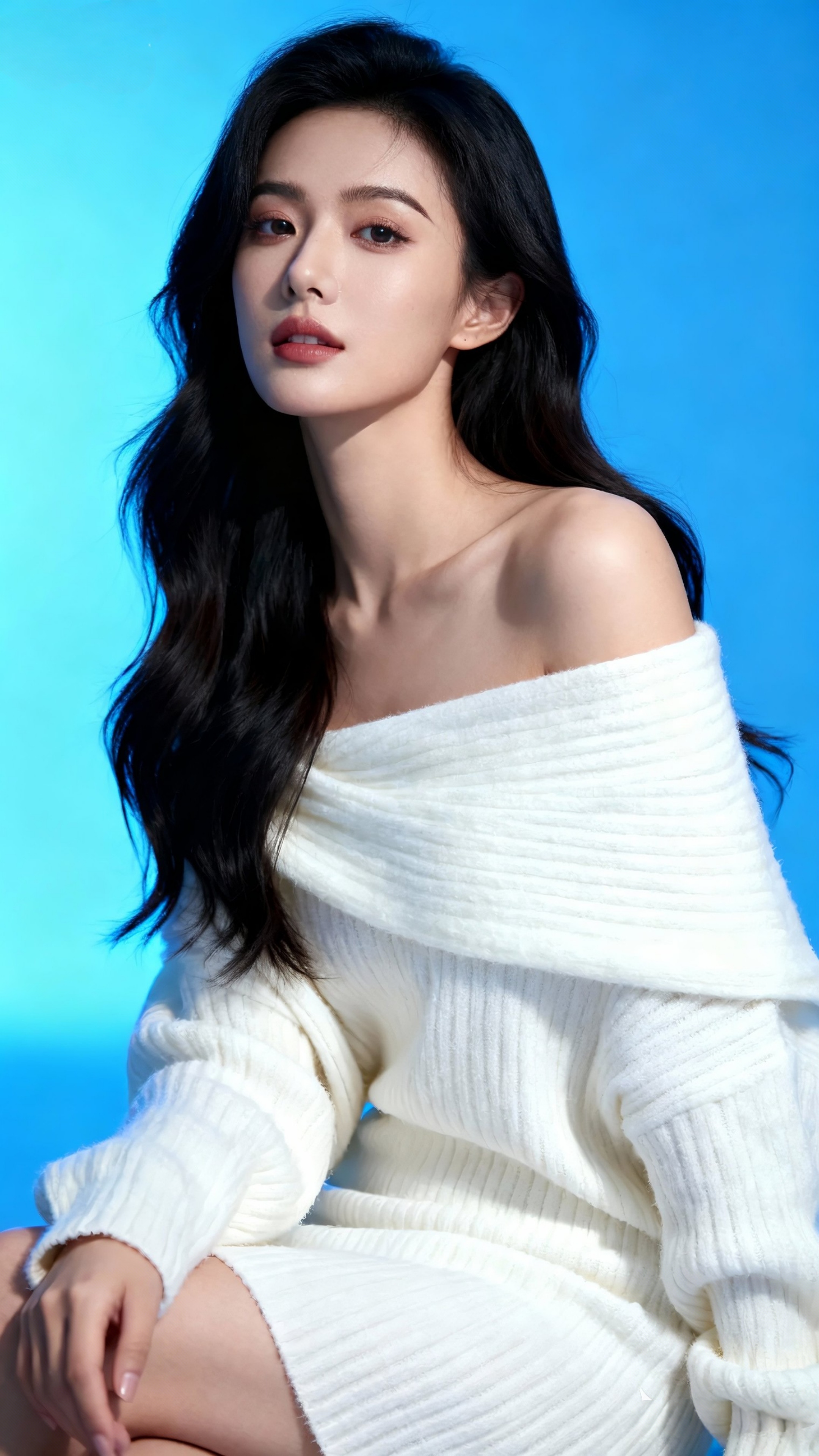 美女小姐姐,漂亮脸蛋,时尚服饰,穿白色毛衣裙,露单肩,轮廓分明,肤白貌美,高清,庄雅,画面质感佳,光线明亮,人物摄影写真。风华绝代,明艳妩媚,超高清,写真共享美人靓照