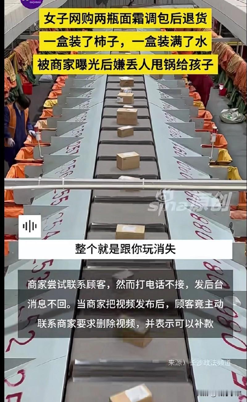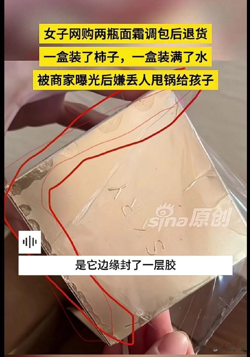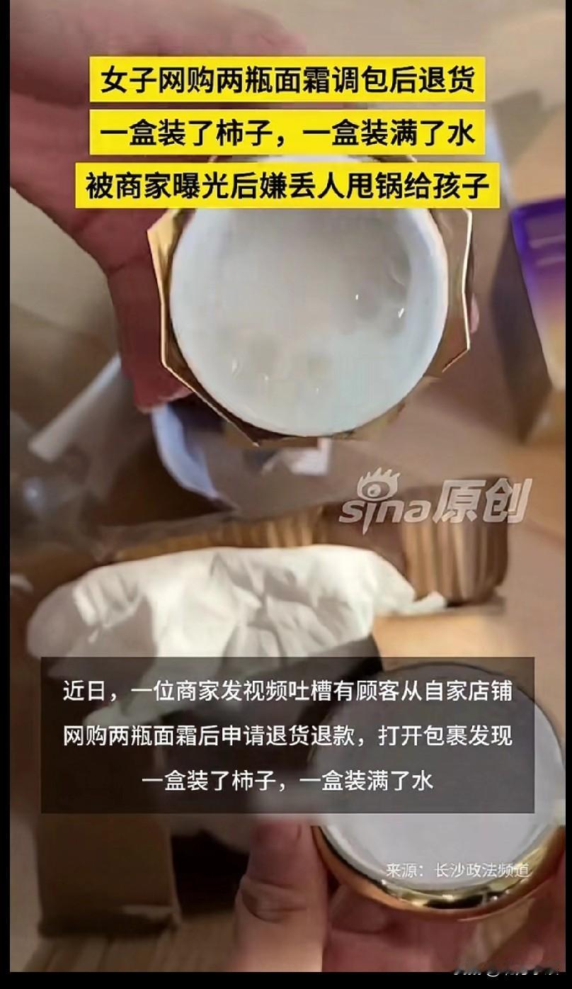 买不起就不要买!女子网购了一套化妆品,收到货后申请退货退款,本身网购也支持7天无理由退货,这也是无可厚非的,但是她退回去的却不是化妆品,而是柿子和水!! 原来她把柿子装进化妆品的盒子,并且把塑封膜也包好,把开封的塑封膜用胶水粘好;另一瓶化妆品,瓶子中装的是水。商家收到货后,并没有打开看看盒子里面的东西,就确认收货,把女子的钱退了回去,后来打开才发现这些,把商家可气坏了! 商家随即联系该退货女子,但是该女子购物平台信息不回,电话不接,就像消失了一样,没有办法,商家把该事件发到了网上。这回该女子出现了,然而并不是主动承担错误,不是狡辩,就是觉得商家太过分了,为了几十块钱竟然发到网上! 该退货女子表示商家把此事件发到了网上,对她的人身和家庭造成了危害,她已经报警了,并且表示删除视频才能补款,并说只是几十块钱的事情,并不是成千上万的事情,商家不应该抓着不放,并且她已经报警了,她相信警察会给她个有公正的说法。 商家也表示,并不能把删除视频作为给商家补款的筹码,不管删不删视频,该女子都应该给补款! 唉,这购物女子的做法也是绝了,收到货品,如果你不满意,你可以把货退回去,这调包就太阴险了吧,只是几十块钱的东西,犯得上这么大费周折吗?又是装柿子,又是装水的,又用胶水封包装的。更有意思的是,人家追要补款你竟然玩失踪,没有办法发网上了,你又倒打一耙,这人呐,真是的啥人都有!!自己掉包,还有理了!