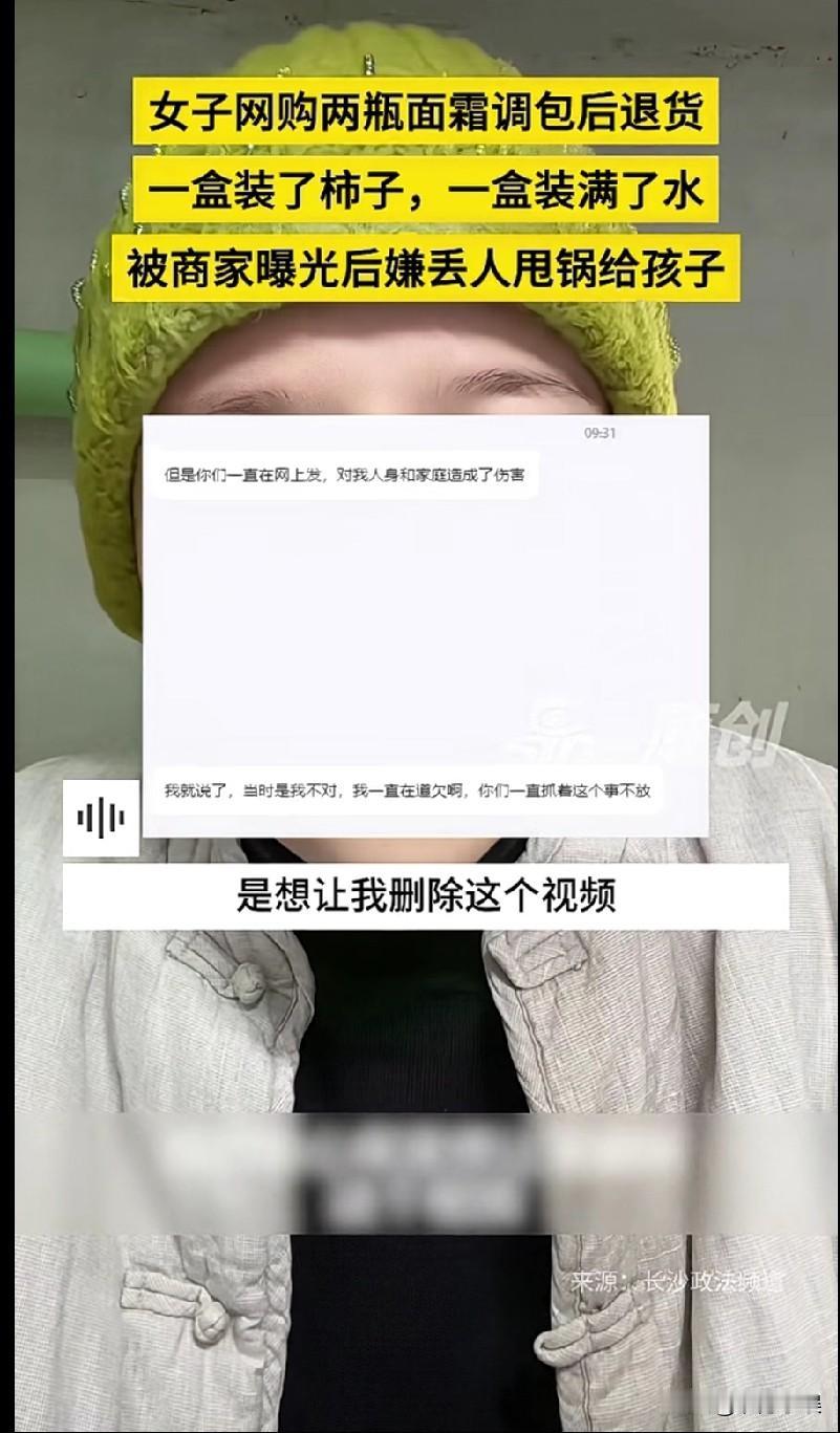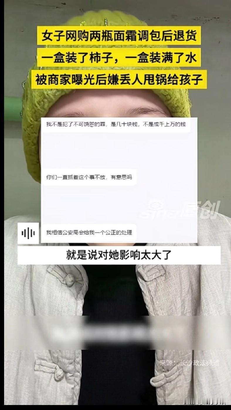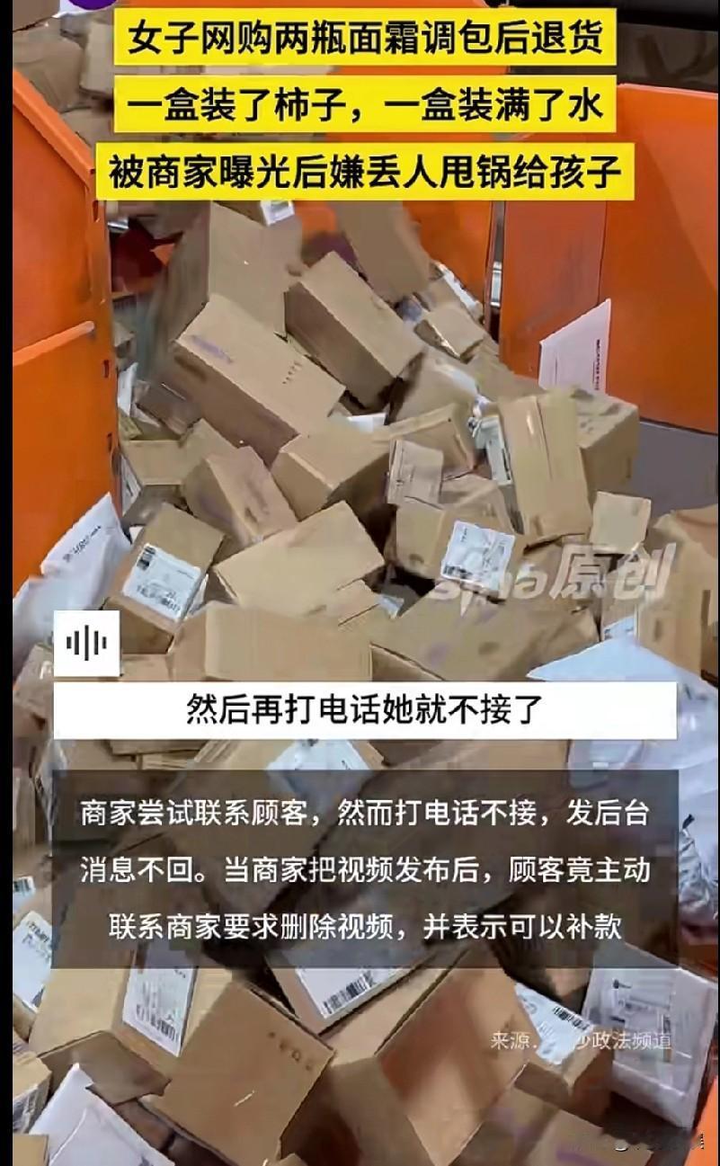 买不起就不要买!女子网购了一套化妆品,收到货后申请退货退款,本身网购也支持7天无理由退货,这也是无可厚非的,但是她退回去的却不是化妆品,而是柿子和水!! 原来她把柿子装进化妆品的盒子,并且把塑封膜也包好,把开封的塑封膜用胶水粘好;另一瓶化妆品,瓶子中装的是水。商家收到货后,并没有打开看看盒子里面的东西,就确认收货,把女子的钱退了回去,后来打开才发现这些,把商家可气坏了! 商家随即联系该退货女子,但是该女子购物平台信息不回,电话不接,就像消失了一样,没有办法,商家把该事件发到了网上。这回该女子出现了,然而并不是主动承担错误,不是狡辩,就是觉得商家太过分了,为了几十块钱竟然发到网上! 该退货女子表示商家把此事件发到了网上,对她的人身和家庭造成了危害,她已经报警了,并且表示删除视频才能补款,并说只是几十块钱的事情,并不是成千上万的事情,商家不应该抓着不放,并且她已经报警了,她相信警察会给她个有公正的说法。 商家也表示,并不能把删除视频作为给商家补款的筹码,不管删不删视频,该女子都应该给补款! 唉,这购物女子的做法也是绝了,收到货品,如果你不满意,你可以把货退回去,这调包就太阴险了吧,只是几十块钱的东西,犯得上这么大费周折吗?又是装柿子,又是装水的,又用胶水封包装的。更有意思的是,人家追要补款你竟然玩失踪,没有办法发网上了,你又倒打一耙,这人呐,真是的啥人都有!!自己掉包,还有理了!