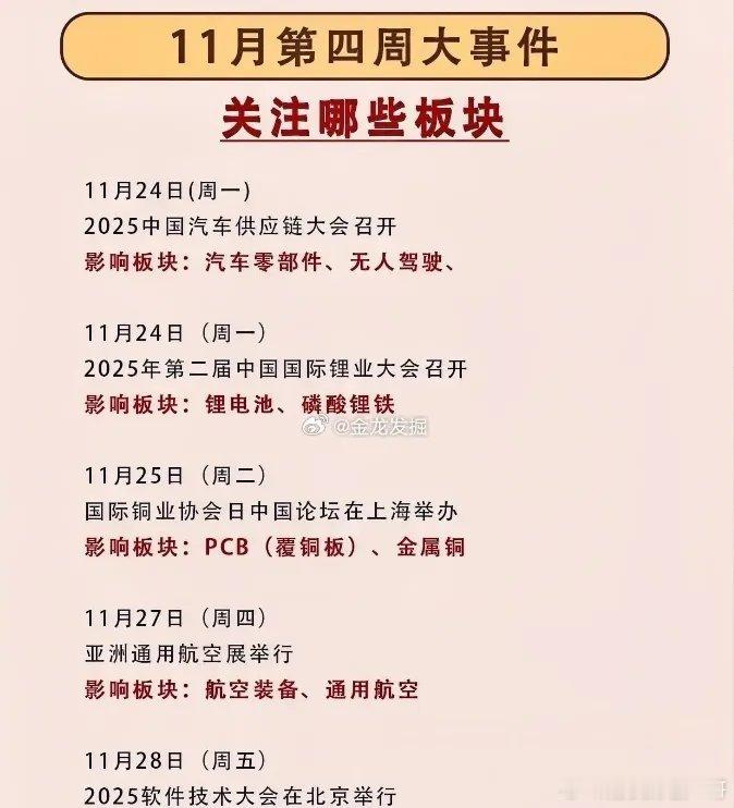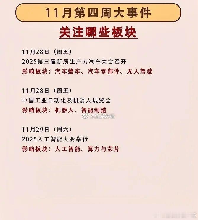 下周热点板块前瞻:聚焦六大高潜力赛道根据11月第四周(24-29日)行业重要会议及展会安排,结合新质生产力与智能化升级主线,梳理出六大具备短期催化icon潜力的板块及对应核心标的:一、汽车零部件/智能驾驶$拓普集团icon sh601689$ :智能驾驶线控底盘核心供应商,深度绑定主流车企旭升集团icon:新能源车轻量化部件领先企业,技术契合汽车轻量化趋势文灿股份:一体化压铸技术先锋,受益整车制造效率提升二、锂电池/储能$宁德时代icon sz300750$ :全球动力电池龙头,磷酸铁锂icon技术持续领先比亚迪icon:刀片电池icon技术开创者,实现电池-icon整车全链条布局亿纬锂能icon:动力与储能电池双轮驱动,技术路线多元化三、PCB/铜材$生益科技icon sh600183$ :覆铜板领域国内龙头,直接受益铜材应用拓展沪电股份icon:高端PCB领先企业,汽车电子与通信需求强劲江西铜业icon:铜产业链上游核心资源企业,行业风向标四、通用航空中航沈飞icon:军机与通航装备核心制造商,技术实力雄厚中航西飞icon:民用航空装备主力,大飞机icon制造领军企业洪都航空icon:通用航空整机及配套服务重要供应商五、机器人/工业自动化埃斯顿icon:国产工业机器人领军企业,自动化解决方案完善汇川技术icon:工业自动化控制龙头,伺服系统国内领先绿的谐波icon:机器人核心零部件专家,减速器技术突破者六、人工智能/算力科大讯飞icon:AI应用层领军企业,大模型技术持续迭代中科曙光:算力基础设施核心供应商,国产服务器主力用友网络icon:企业级软件服务龙头,AI赋能企业管理升级布局逻辑本周系列行业大会密集召开,涵盖汽车供应链、锂业、铜业、通用航空、新质生产力汽车、工业自动化及人工智能等重点领域,预计将释放产业政策与技术升级新动向。对应板块均处于产业升级核心轨道,相关龙头企业在技术积累、产能布局和市场地位方面具备明显优势,有望成为市场关注焦点。本文为公开信息整理,不构成投资建议。市场有风险,投资需谨慎。