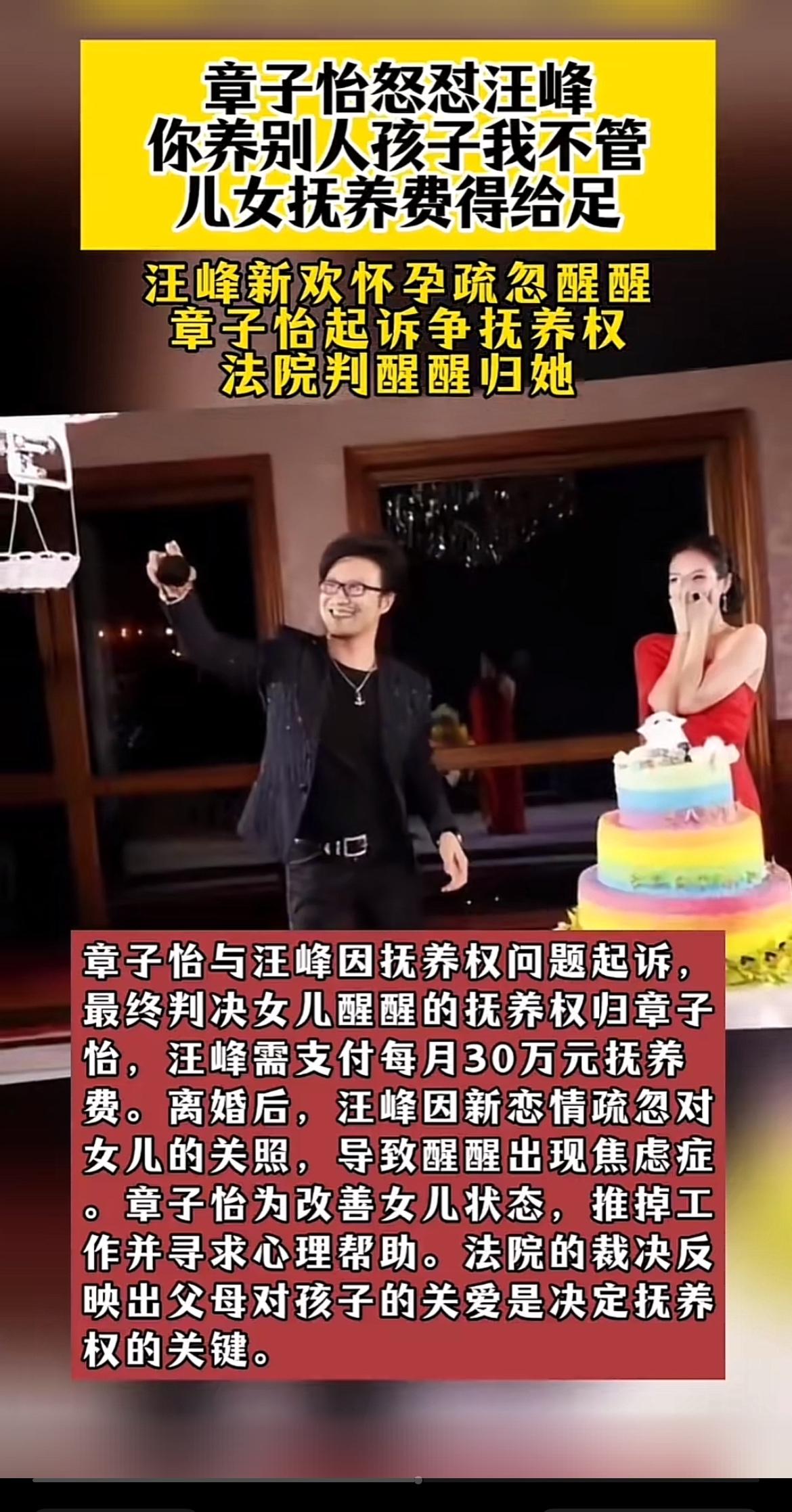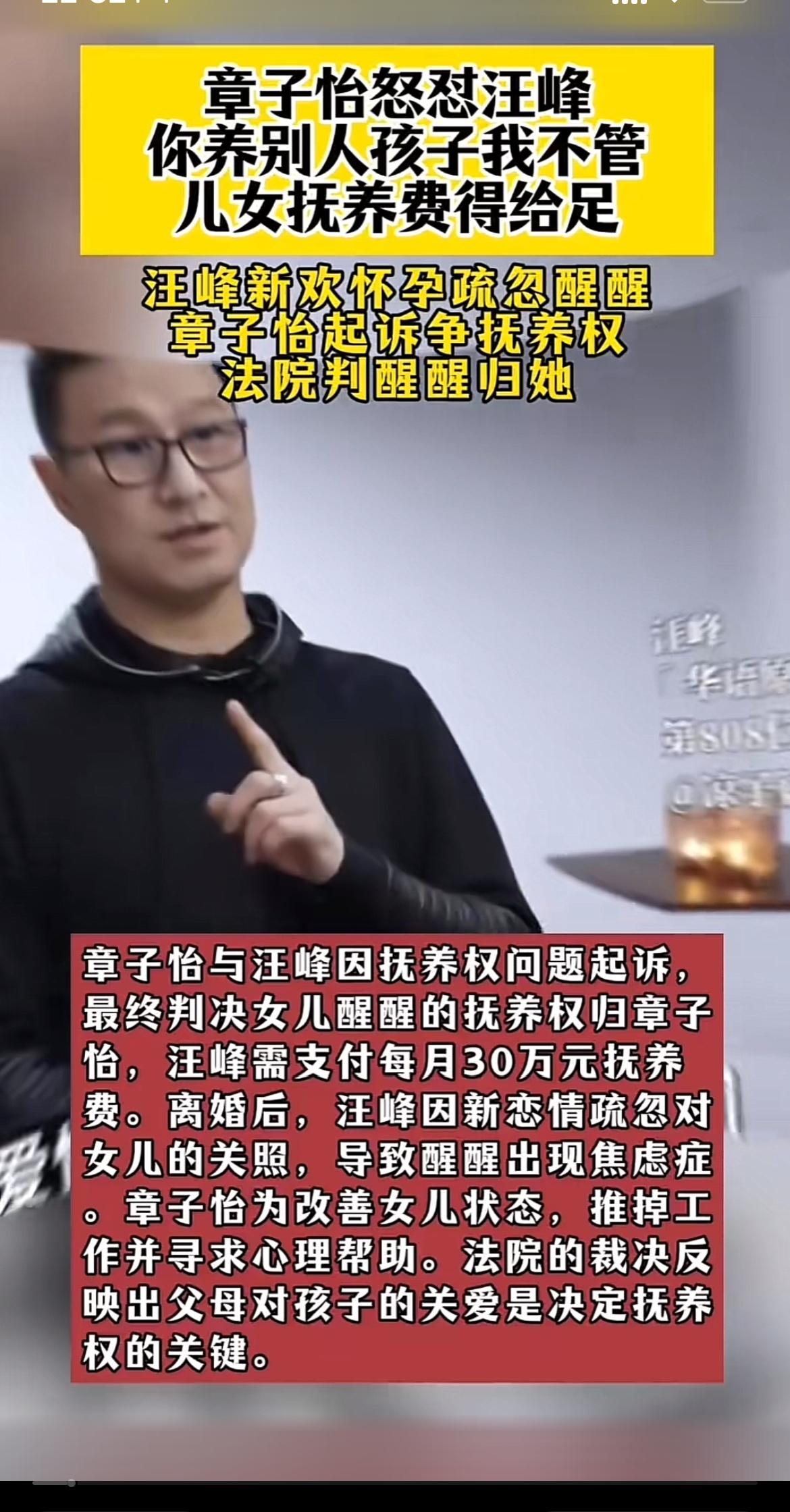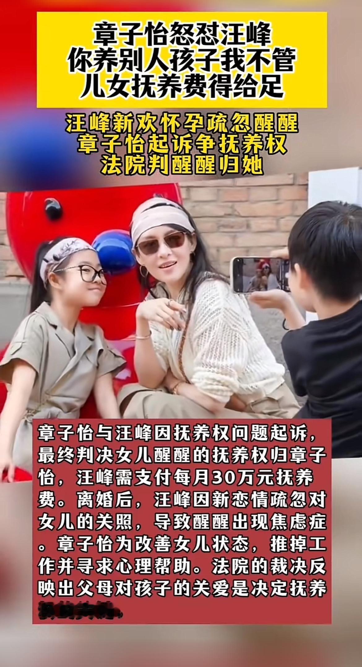章子怡和汪峰这事儿真是够抓马的。2015年结婚生俩娃,去年和平离婚,儿子归章子怡,女儿醒醒跟着汪峰。可不到两年,章子怡就起诉改判抚养权。 原来,汪峰忙着发专辑、跑演出、上综艺,陪女儿时间太少。今年还公开小二十岁的新女友,对方还有俩孩子。章子怡在法庭指出,醒醒心理安全感不足。法院最终判章子怡胜诉,汪峰每月付30万抚养费到女儿18岁,还限他每月见女儿两次。 看看过往,章子怡一直用心带醒醒,送上学、陪练舞,还带她走戛纳红毯。汪峰呢,综艺里很会来事儿,对女儿却不上心。这抚养权的变更,也是情理之中。
