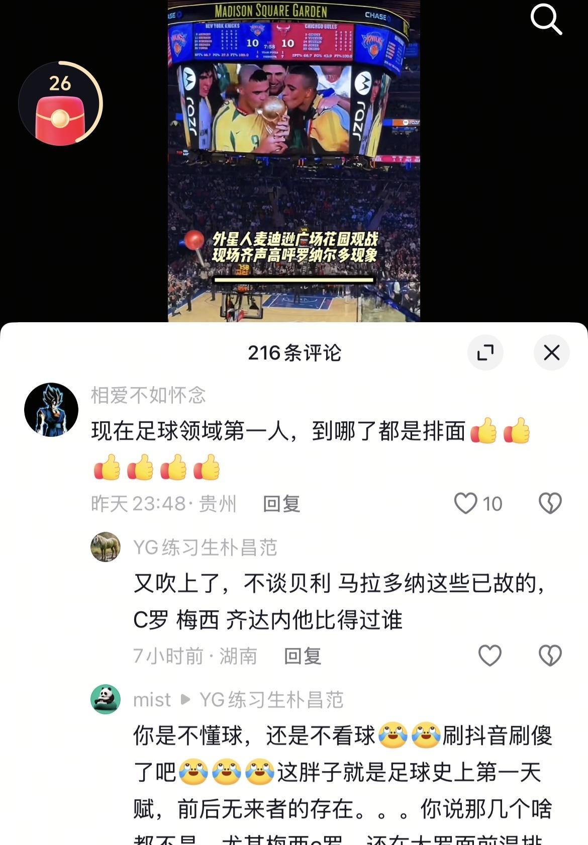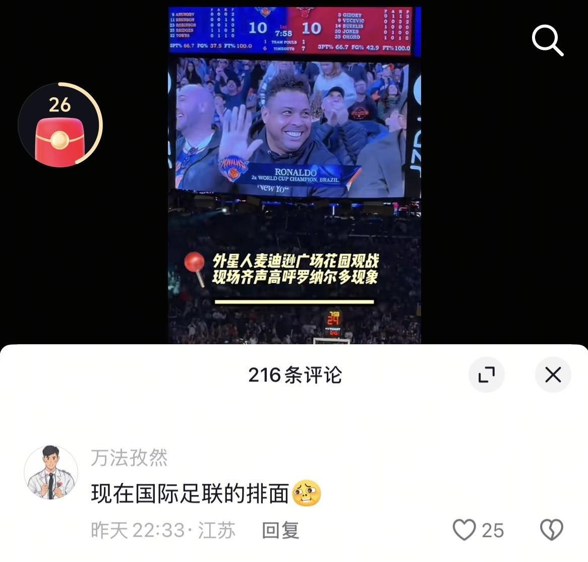 罗纳尔多去美国看NBA比赛,现场大屏幕给了他的特写镜头,还放了一段他的视频。 罗粉一下就炸了: 现在国际足联的排面 现在足球领域第一人 话说梅西还是现役球员,我们都不会刻意说他是“国际足联的排面”。正当红的姆巴佩哈兰德,也没见有人给贴上这个标签。 作为足球史前十的巨星,肥罗在全世界有大把拥趸,更何况他只是退役了,又不是死了,依旧活跃于国际足坛,在媒体上亮相,所以走到哪里都有人致敬,这不是很正常吗?怎么就“国际足联的排面”了? 还“足球领域第一人”,指的是踢球、执教还是管理? 肥罗粉丝意淫起来,就没C罗粉丝什么事了。