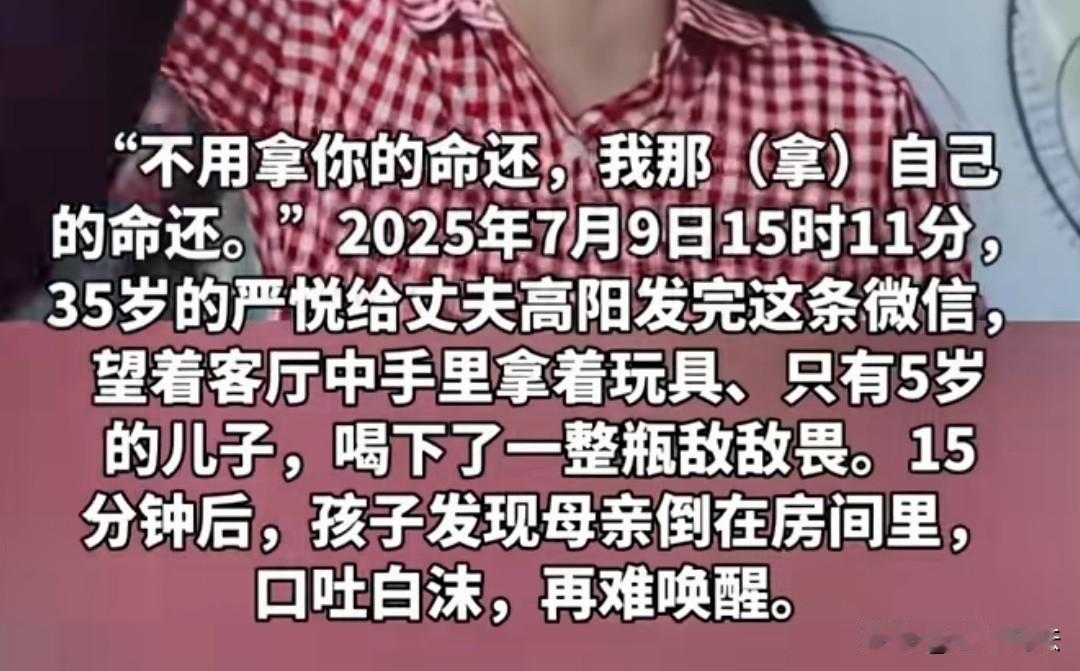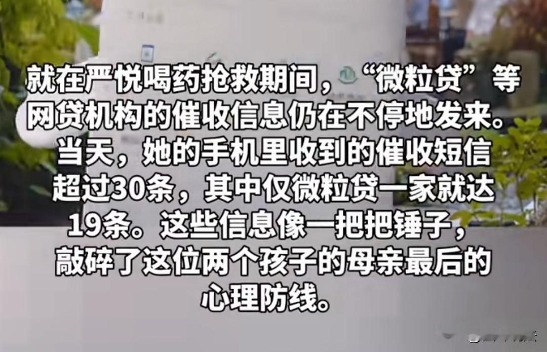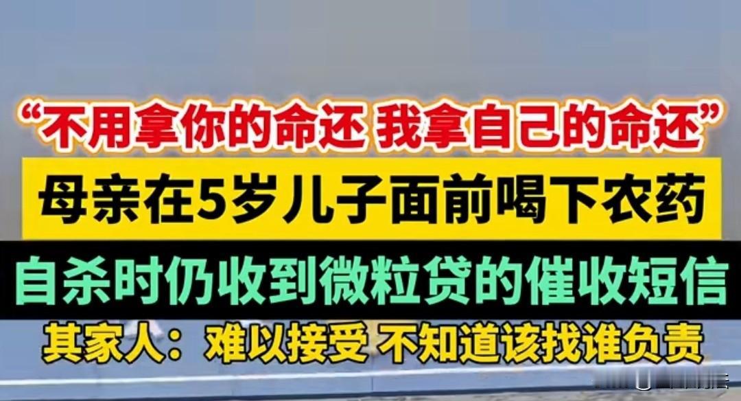 谁之过?湖南长沙,女子欠下网贷46万余元,因无力尝还,迫于家庭和网贷平台的压力,她给丈夫发了一条遗言“不用拿你的命还,我拿自己的命还”之后,在5岁儿子面前喝下一整瓶农药,抢救无效永远离开了。女子离世后,家人难以接受,不知道找谁负责。 严悦原本有着一个幸福的家庭,丈夫高阳负责挣钱养家,而她负责在家照顾孩子,一家4口其乐融融。 然而这幸福的生活在2022那一年悄悄在改变,因为高阳从事的行业业务萎缩,他的工资也急剧减少,一年也只能拿回家里3万左右。 这也就算了,然而屋漏偏逢连夜雨,后来又被熟人骗走10万元,最终只能变卖所有个人名下能卖的财产偿债。 可那些钱根本不够还债,即使拆东墙补西墙,但还是无可避免地成了信用黑户。 孩子的教育,家庭的日常开支都要钱,怎么办呢?严悦实在是没有办法,只能靠借贷来维持花销。 开始的时候,她从银行贷了20万,后来为贴补家用、交学费,她办了多张分期信用 卡,又向某平台借了7万多元。 借了这么多钱,仅靠丈夫高阳的工资根本不够偿还,而女子想工作又不能,她非常的烦恼。 都说贫贱夫妻百事哀,严悦和丈夫有的时候谈到债务问题就产生矛盾。 严悦觉得她并没有什么错,借的钱都用在孩子和家庭中,有时候她抱怨丈夫没有用,要不是他挣不到钱,她会借这么多钱吗? 她最受不了的事,她一心一意为家庭,结果丈夫还埋怨她花钱多,有的时候高阳心烦,一想到这么多债,就会抱怨是不是要用命去还。 后来,因为花销大,挣得少,慢慢的债务越来越多,每个月要还好几千,高阳的工资根本不够还,有些贷款就逾期了。 严悦着急啊,可她却毫无办法,只能接受贷款平台的催款电话和短信。 每一次电话铃响,严悦都是提心吊胆的,她都不敢接,害怕对方说什么不好听的话。 电话不接,对方就发短信,时不时发来催收短信。 每一次的催收短信,都在提醒严悦所欠的钱,让她的压力一次比一次重,压得她喘不过气。 她那一段时间,很需要家人的安慰与帮助,可她不敢和娘家说,怕父母担心。 高阳他也同样面临着压力,自顾不暇,根本没有精力去照顾妻子的感受。 在这种孤立无援的情况下,网贷平台的催收短信就像催命符,敲碎了严悦最后的心里防线。 2025年7月9日15时11分,严悦给丈夫高阳发了一条微信,内容是:不用拿你的命还 我拿自己的命还。发完信息后,她望着客厅中手里拿着玩具、只有5岁的儿子,喝下了一整瓶敌敌畏。 15分钟后,孩子要找妈妈,来到房间发现母亲倒在房间里,口吐白沫,他寻求了帮助。 虽然严悦很快被送去医院,但最终没有抢救过来。 在抢救期间,网贷机构的催收信息仍在不停地发来。据统计,当天她的手机里收到的催收短信超过30条。 对于严悦的自杀身亡,她的家人难以接受,觉得和网贷机构有关系,但又不知道找谁负责。 11月12日,高阳请假回到县城领取事发后的 《报警案件登记表》,其表示这作为日后可能的维权依据。 也许严悦的家人认为其自杀和网贷机构的催收有关,日后可能要这些机构承担侵权责任。 《民法典》第1165条规定:行为人因过错侵害他人民事权益造成损害的,应当承担侵权责任。 这些贷款机构是否要为严悦的自杀负责,这要看两者之间是否存在因果关系。 但严悦作为成年人,借款应该量力而行。而贷款机构的利息一般也是比较高的,但其利息没有超过规定,他们不存在违法放贷。 他们放贷的目的就是盈利,向严悦这样的贷款人,逾期了平台肯定是要催收的,他们催收并没有不妥。 如果是正常催收,他们应该不承担侵权责任;但如果他们催收短信存在威胁之意,想要事不关己高高挂起,那不大可能。 严悦的悲剧,您认为贷款平台有责任吗?