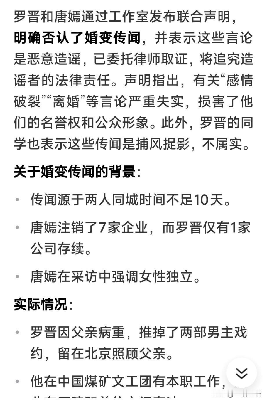 我就说罗晋和唐嫣没离婚,果然,是人们造谣! 罗晋工作室已经严正声明,传言中的离婚,纯属子虚乌有,人家还要依法追究造谣者的法律责任呢! 罗晋的父亲于11月19日去世这件事,却是真的,家中有这么大的变故,还有人恶意造谣以博流量,确实不应该。 一天不官宣,就不能乱说,说罗晋父亲在北京去世,而唐嫣的IP地址在上海,就说唐嫣和罗晋已经分开,有些牵强。 毕竟,演员是个特殊职业,不是你想走就能走得开的。 你没见播音员自己家里亲人去世,还得直播吗? 人在江湖,身不由己,没办法!