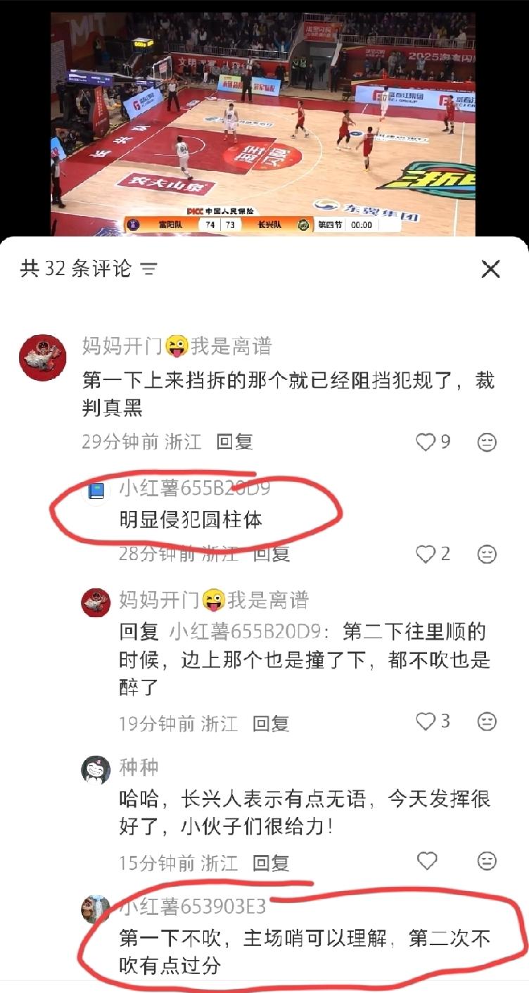 富阳队最后一球真的没有“阻挡犯规”吗? 评论区球迷也是一致的认为富阳球员有明显的犯规动作:第一下不吹,主场哨可以理解,第二次不吹确实有点过分了! 如果富阳队是凭这样的过程赢下比赛的,试问有谁会服?如果富阳是这种状态,能在接下去的比赛中击败苍南和丽水吗?