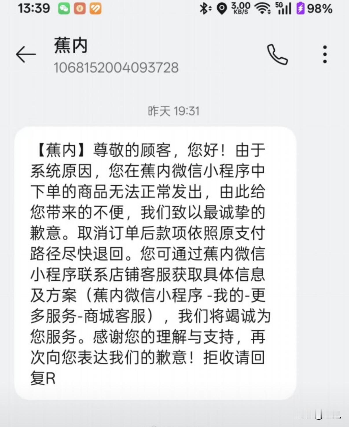 花762元买了20多件蕉内商品,最后却只等来了30元补偿和一条取消订单的短信。这位较真的张先生,一纸诉状把商家告上了法庭。 11月18日,蕉内官方小程序一场突如其来的“骨折价”。原价六百、七百多的羽绒服和冲锋衣,统统只卖22元。不少消费者以为捡了大便宜,纷纷下单付款。 等来的却不是发货通知。当晚,许多下单者就收到了蕉内的短信,被告知因“系统原因”无法发货,建议取消订单。官方客服后来的回应很一致:这是**系统异常导致的价格偏差**,不是官方活动,订单一律不发货,只能退款。 面对消费者的不满,蕉内提出的解决方案是:**补偿30元**。这个方案显然难以平息众怒。 **消费者张先生无法接受的理由很明确**:他下单时,小程序里同时存在22元、69.5元乃至一百多元、两百多元的商品,他认为是正常折扣,而非明显的系统错误。而且,在他看来,即使是系统问题,也是商家的责任。 这不仅是一场关于几十元或几百元订单的纠纷,更触及到一个重要的法律问题:**商家单方面取消已付款的订单,到底合不合法?** 根据律师的分析,用户提交订单成功,合同即视为成立。商家若想以“系统异常”为由拒绝发货,需要承担举证责任,证明价格确实存在重大误解。如果无法充分证明,单方面取消订单就可能构成违约。 目前,张先生提交的立案申请尚在待审核阶段。这起诉讼最终如何裁定,将取决于法院对“重大误解”的认定,以及蕉内方面能否提供强有力的技术证据。 对于商家而言,技术故障难以完全避免,但完善的系统和诚恳的事后处理机制至关重要。对于消费者,张先生的举动提醒我们,遇到不公的消费待遇时,可以选择依法维权。 您觉得商家应该为这样的“系统错误”买单吗?
