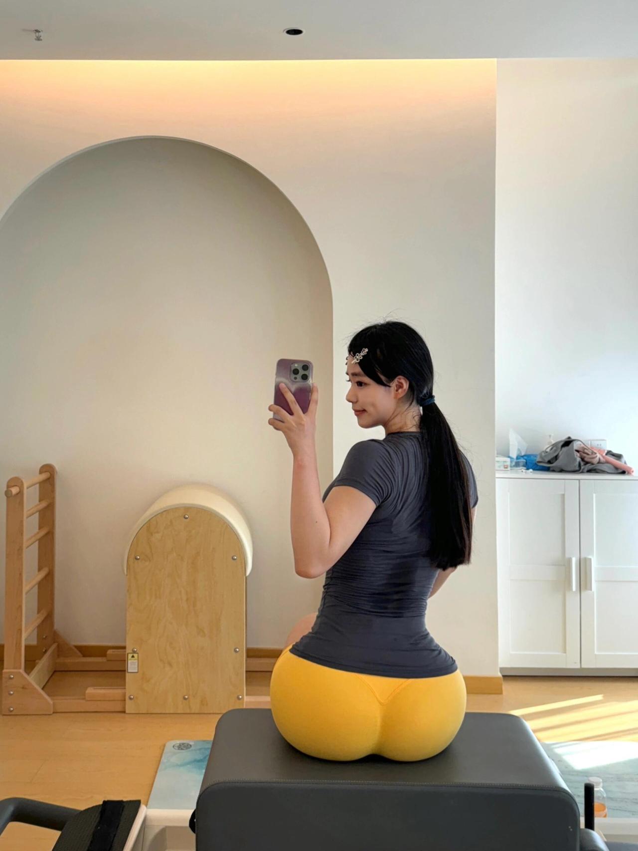 家人们谁懂啊!健身房偶遇的蜜桃臀女神也太顶了!灰T配亮黄瑜伽裤往训练架一坐,这腰臀比简直绝了! 阳光从窗户斜打进来,马尾辫梢都泛着金光,连影子曲线都这么撩人。最绝的是人家随便举着手机对镜拍,腿长直接冲出屏幕! 要我说健身的女孩自带高光,这饱满的线条得流多少汗才练得出来?难怪旁边练二头的大哥哑铃差点砸脚。兄弟们把自律打在公屏上!