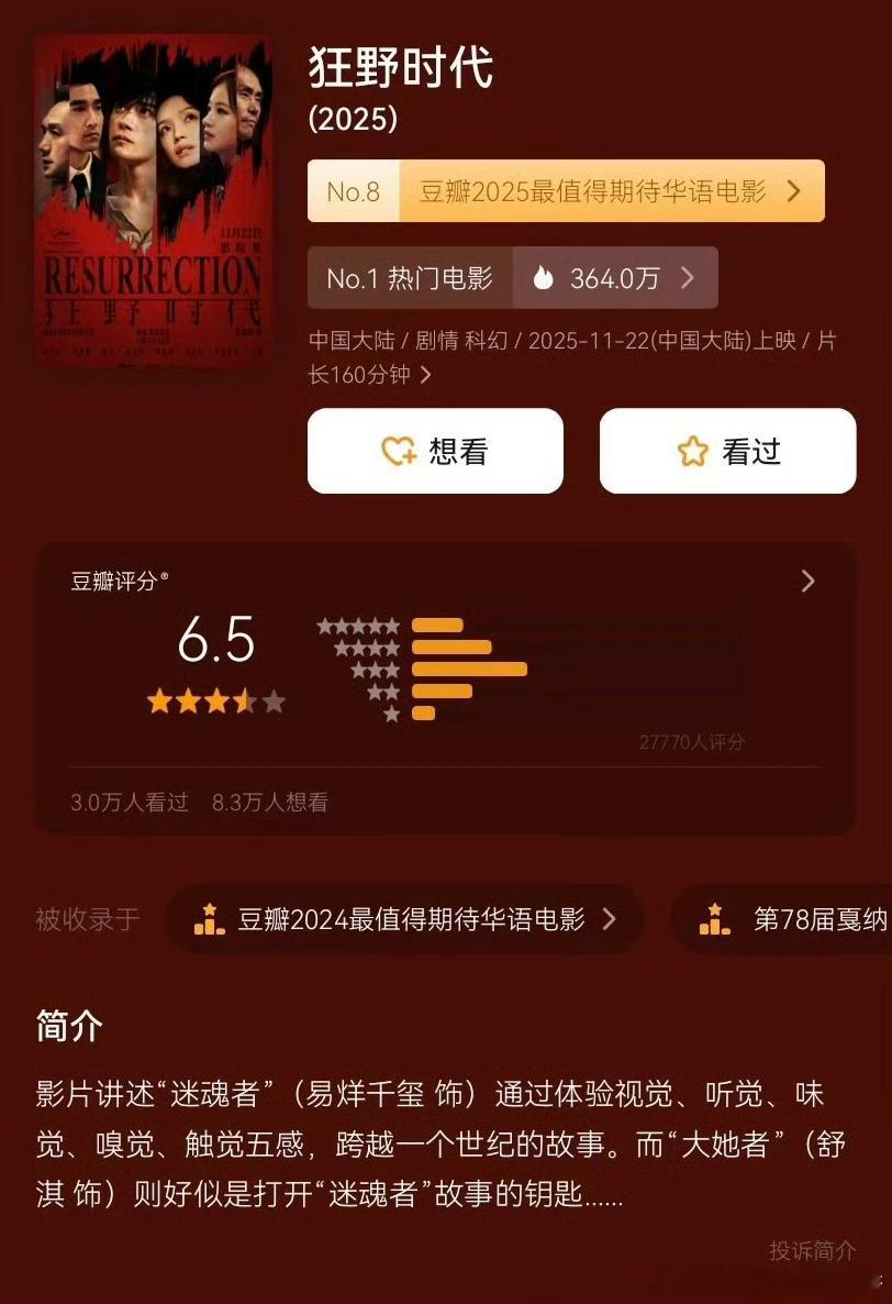 易烊千玺、舒淇《狂野时代》豆瓣开分6.5
