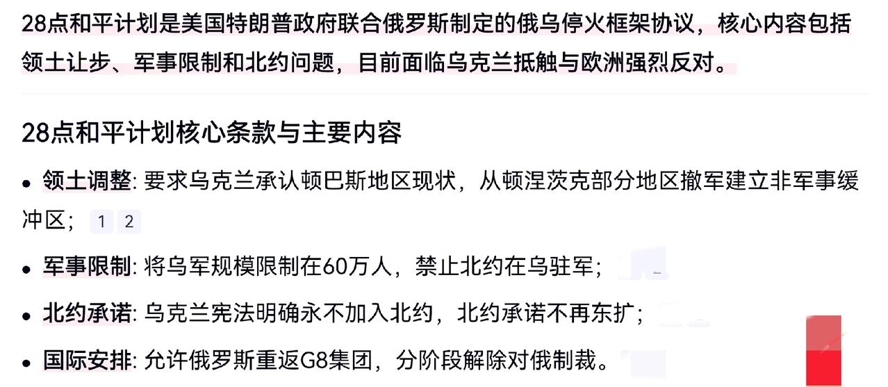 特朗普替泽连斯基卖了乌克兰。特朗普在没有乌克兰参与的情况下,与俄罗斯沟通从而拟定了个“28点和平计划”,虽然俄罗斯否认参与其中,但一看协议内容里外都透着俄罗斯的味道,对乌克兰极为不利。 虽然协议的具体细节和内容没有公布,但从已经透露的部分内容看,对于乌克兰来说就是个丧权辱国的协议。泽连斯基现在真是骑虎难下呀,在协议上签字,就等于把自己钉上了历史耻辱架,不签字,乌克兰就有彻底战败和亡国的威胁,这绝不是危言耸听。 特朗普拟定的“28点和平计划”实际上是替泽连斯基起草的投降书,是不折不扣的卖国协议。曾经依靠的主子,如今把自己卖了个精光,泽连斯基心里滋味一定是五味杂陈,难怪会发出:“乌克兰历史的至暗时刻”的哀嚎。学者:特朗普28点计划逼乌割地让步 泽连斯基对28点计划的态度如何 你认为特朗普出卖了乌克兰的利益吗 (图片来自网络)