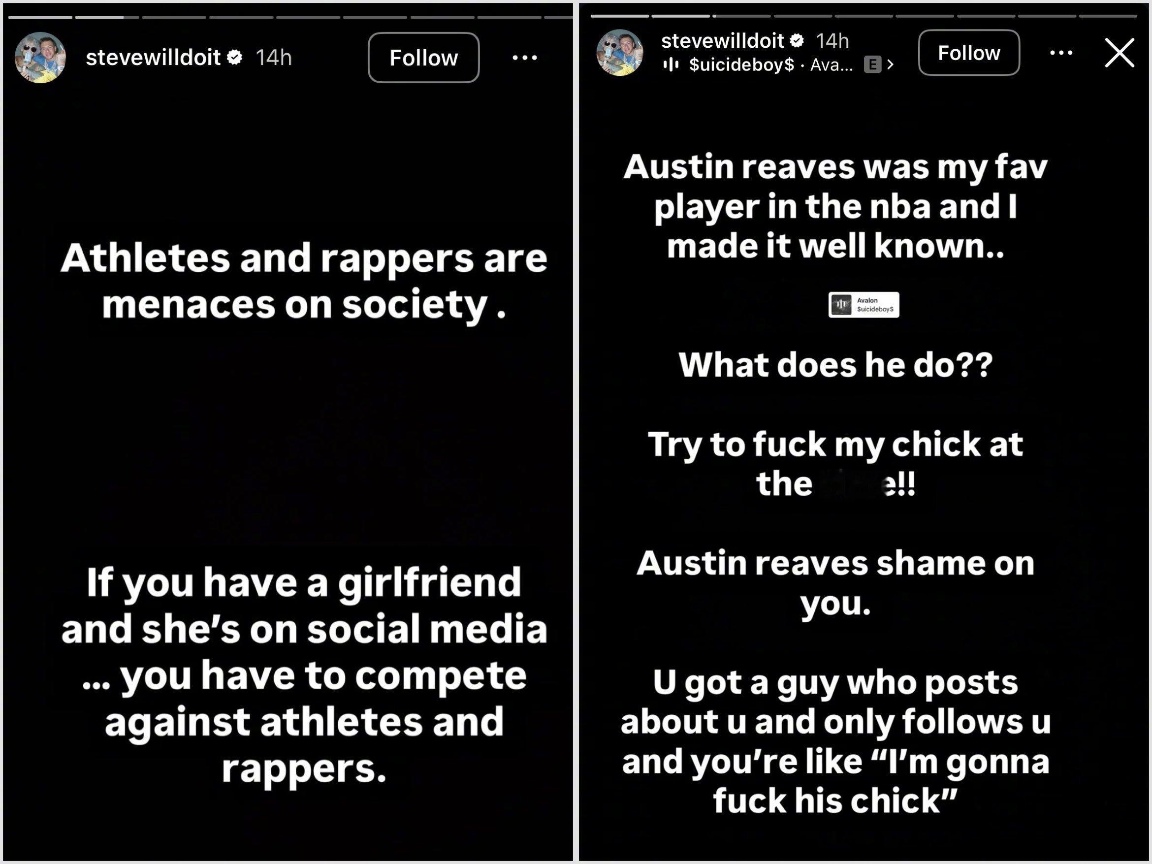 网红SteveWillDoIt公开谴责里夫斯曾试图勾搭他当时的女友Celina Smith。SteveWillDoIt公开写道:“里夫斯是我最喜欢的NBA球员,可他干了什么?他居然试图搞我当时的女友!里夫斯,你可真无耻。我支持你关注你,你却想着‘我要去搞他女友’。你就是毒瘤,必须制止。我不生气,没人对不起我,我只是在为所有普通男性发声。运动员和说唱歌手都是社会毒瘤,如果你有女朋友,而她又玩社媒,你就得跟运动员和说唱歌手竞争。”