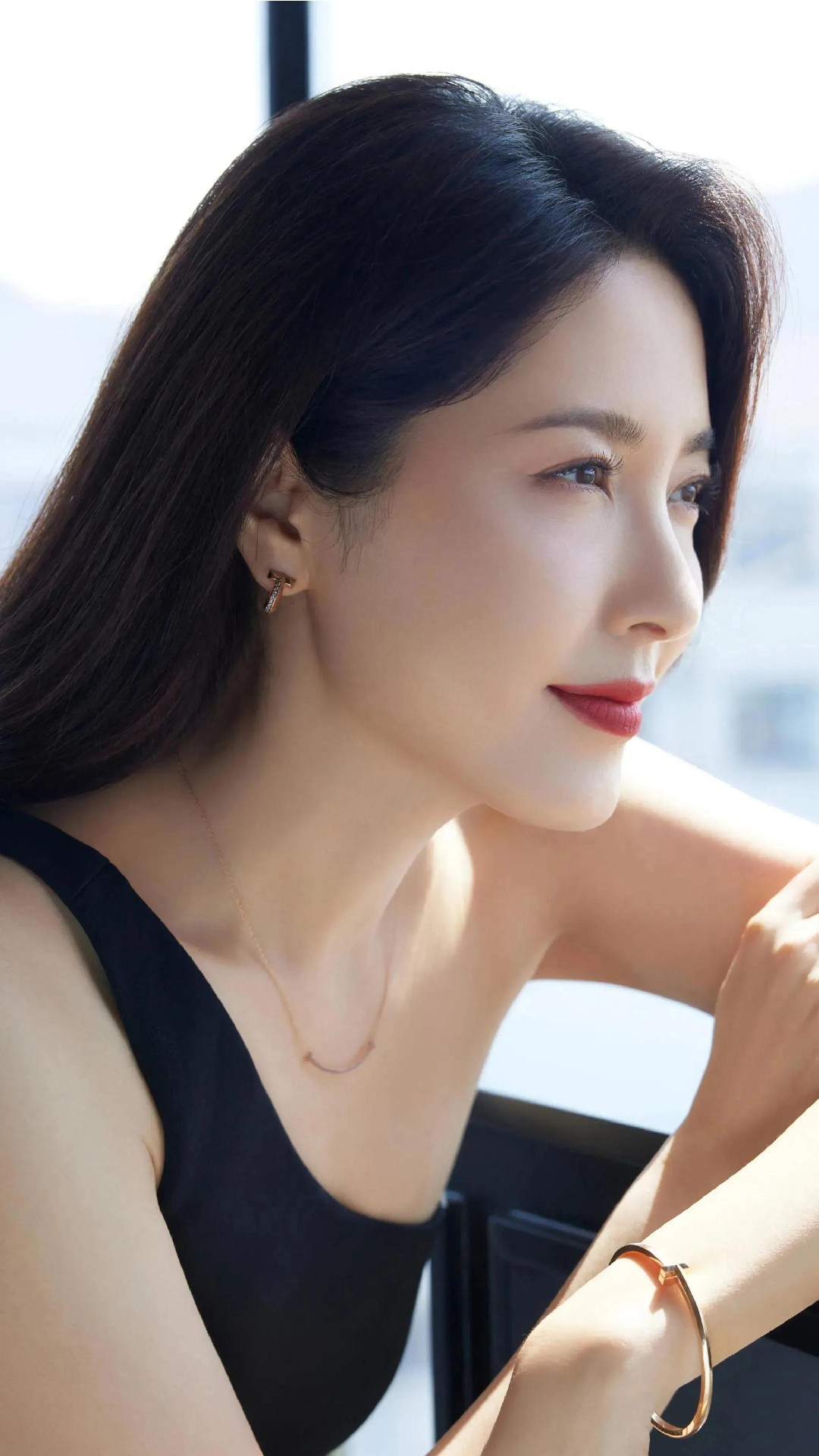 高圆圆暗红色衣裙,长发披肩,五官明艳大气,坐姿优雅端庄,气质干净清新。...