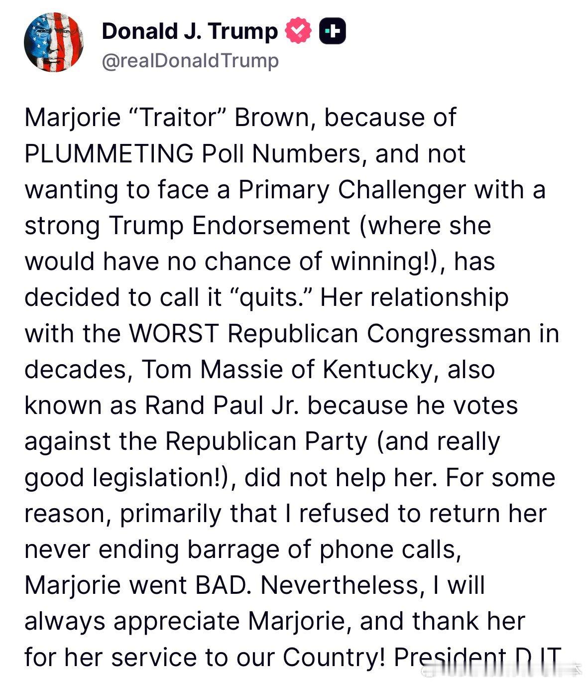 【黄金时代】川普透露,马娇蕊之所以变坏,从绿色(格林)变成棕色(布朗),是因为自己总不接她的电话轰炸(渣男啦?)玛娇蕊“叛徒”布朗因为民调数字暴跌,并且不愿面对一个拥有特朗普强力背书的党内挑战者(在这种情况下她完全没有胜算!),已经决定“退出”。她与几十年来最差的共和党众议员——肯塔基州的汤姆·马西(因为总是投票反对共和党而被称作“小兰德·保罗”)——的关系也没有帮到她(而且他还反对非常好的立法!)。不知什么原因,主要是因为我拒绝接听她那永无止境的电话轰炸,玛乔丽“变坏了”。尽管如此,我仍然会感谢玛乔丽,并感谢她为国家所做的服务!——DJT总统