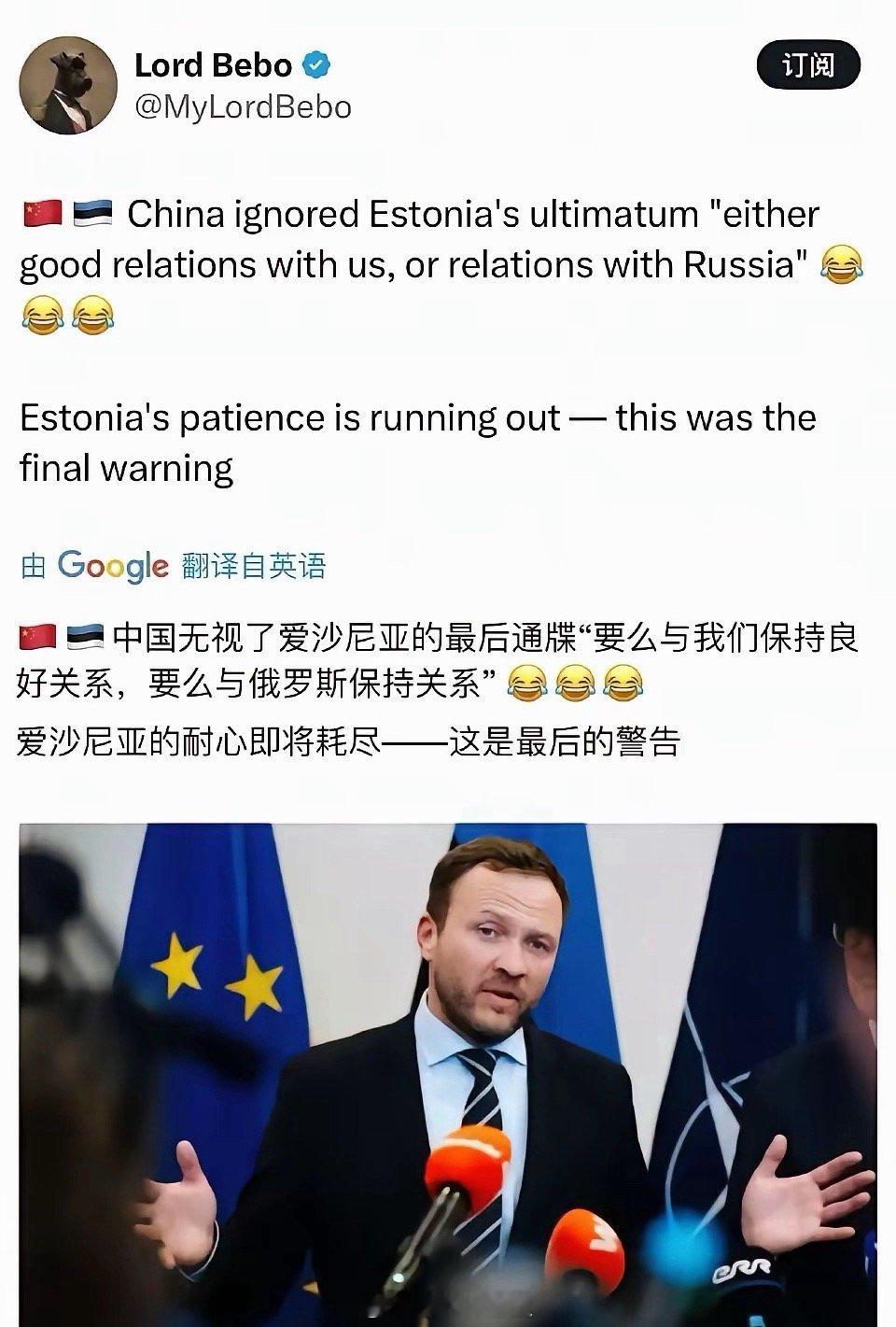 不愧是波罗的海三傻呀!这智商跟立陶宛有一拼了。爱沙尼亚对中国发出了最后的警告。因为中国无视了爱沙尼亚最后的通牒。爱沙尼亚威胁中国,要么与我们保持良好的关系,要么与俄罗斯保持关系。大家听听,这不就是幼儿园小孩玩的游戏吗?你只许跟我玩,不许跟他玩。你只许跟我好,不许跟他好。你跟我好了之后,你手里的糖就得给我。你如果不答应我,不听我的话,那我以后就永远都不跟你玩了。多么完美的幼儿园逻辑啊。永远有多远,你给我滚多远。真当自己是太阳了?地球围你转吗?