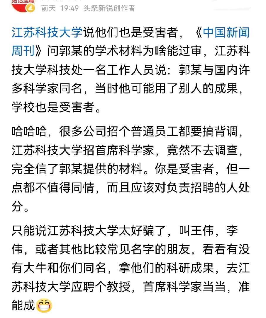 江苏科技大学这个中学学历混成博导的事情还在发酵,估计还有不少内幕将陆续出来。匪夷所思的事件背后,总有奇形怪状的人,我们继续等着。