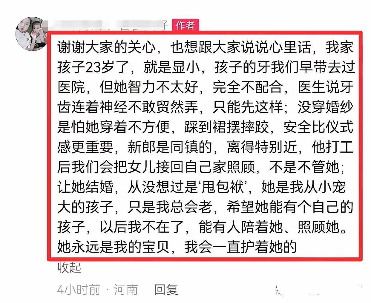 河南一名23岁智力残疾女孩近日出嫁,婆家给了9.9万彩礼,婚礼上女孩没穿婚纱,不少人质疑是娘家拿女儿换彩礼、甩包袱。 女孩妈妈面对网友质疑回应称,女儿不穿婚纱是担心她踩到裙摆摔跤,安全比仪式感重要;新郎是同镇的,腿部略有残疾,离得近方便照顾,婚后还会把女儿接回自家照料;让她结婚从不是甩包袱,而是自己以后老了,想给女儿找个伴,等自己不在了,有人能陪着她、护着她。 可怜天下父母心! 网友评论: 我们这边在70年代也有一智障女孩嫁人生了一对儿女、儿子是工地钢筋工老板、身价早过千万、女儿嫁到了香港、女孩老公也是金主! 前几年回家把智障娘接到香港专门请了一个保姆。祝福这对残障新人开枝散叶! 这样的事情农村还是城市太多了,我们村有两个,我舅妈就是智商问题,每天只知道傻笑,我表舅还是残疾人,他们婚后生活幸福,还生了一个健康女孩,我表妹,我表舅照顾舅妈可好了。 顺着生活走,他们也是生活的最好选择。多理解,生活中的不容易。母亲这样的安排是对女儿的爱,不同的安排选择都有存在的理由。