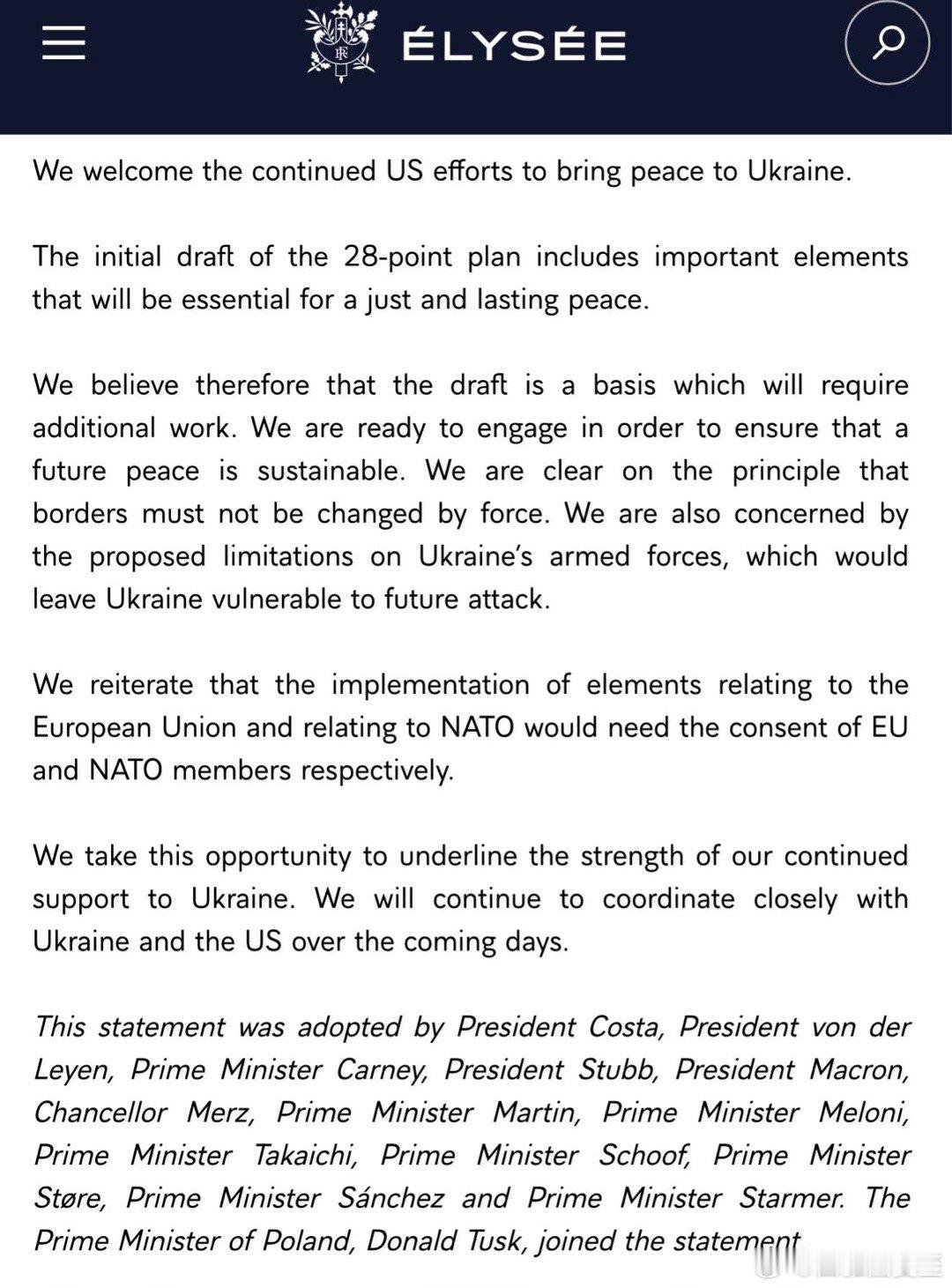 乌克兰主要盟友,英法德意波芬荷西挪日加,发表联合声明:欢迎美国的努力,28条部分可取,这个草案可作为基础,可持续的解决方案需要继续谈判…原则是,国界不能用武力改变,乌军要能抵抗未来的袭击,涉及欧盟和北约的内容需要成员国同意我们继续支持乌克兰,我们会和乌克兰、美国协调