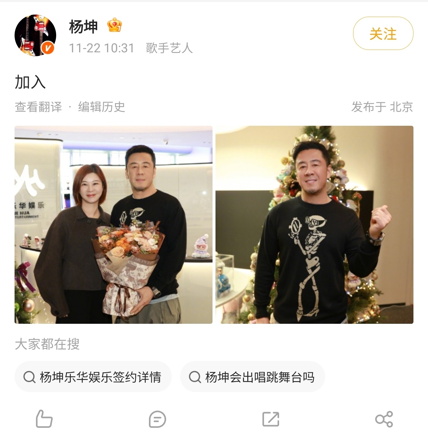 杨坤是不是被忽悠了?歌手杨坤高调宣布加入乐华娱乐,并且还配合发布了宣传视频。评论区里,看杨坤的意思好像是要在乐华这边搞唱跳。咱就说,杨坤都一把年纪了,这个岁数还搞唱跳,是不是对唱跳有什么误解呀?而且像他这样的老牌艺人,不都应该成立公司和工作室自己干吗?他签约乐华是想要干什么?取代王一博成为乐华一哥吗?