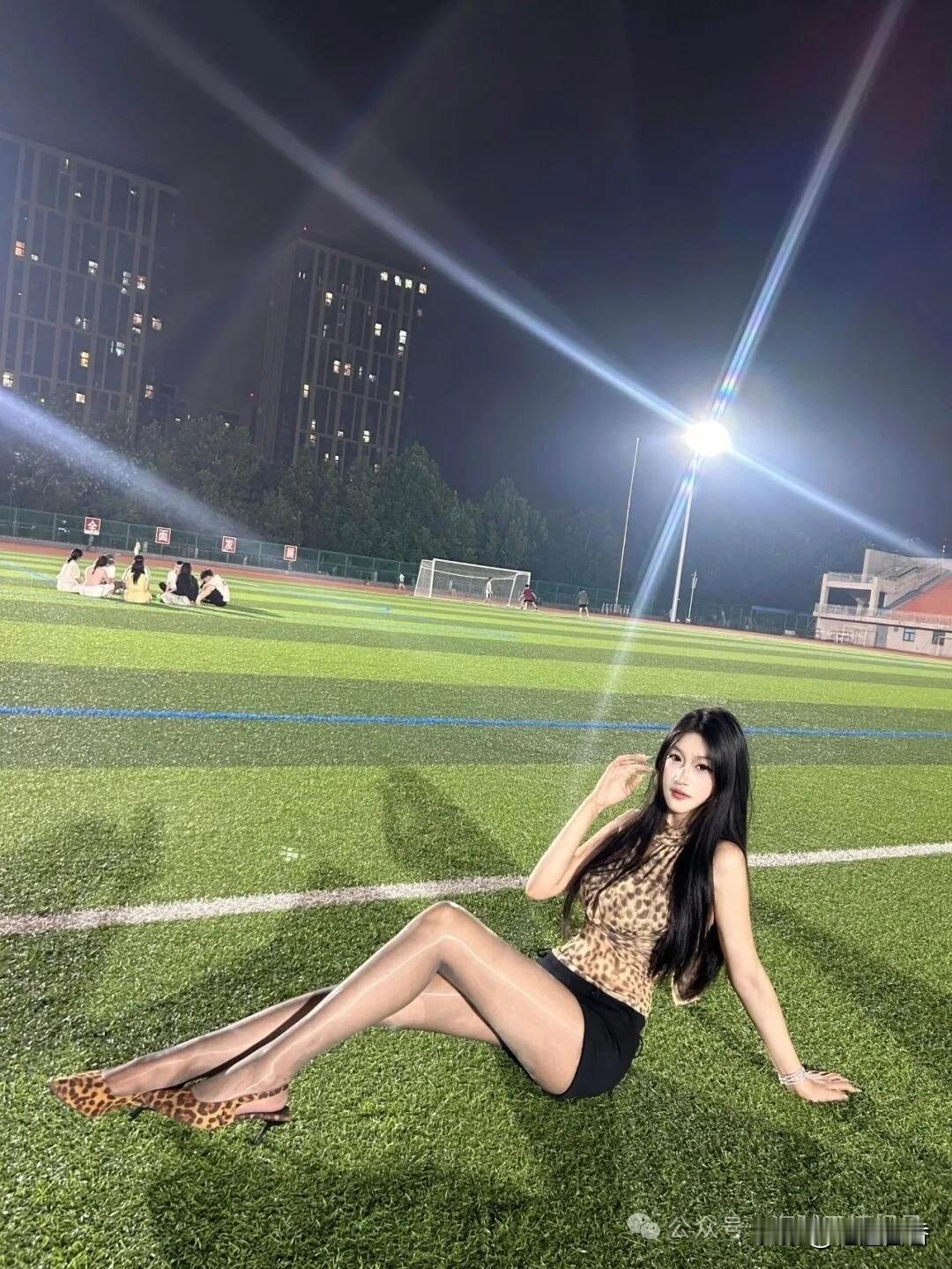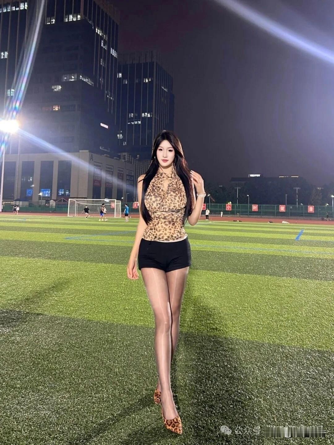 夜晚操场上的时尚少女,豹纹上衣与高跟鞋的完美搭配,尽显都市魅力!🌟✨