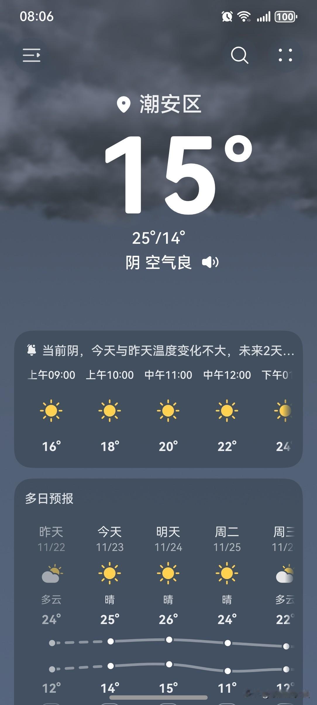 较强冷空气将影响我国!广东周末延续晴燥天气画风,下周将迎来新一股冷空气。 23~24日白天,广东大部市县天晴干燥,气温缓慢回升,昼夜温差大,早晚清(寒)凉;24日下午到25日,新一股弱冷空气将自北向南影响我省,全省大部多云转晴天,气温小幅下降。 今天(23日),潮州喜提一个多云天气,气温14~25℃,此刻气温15℃,体感温度12℃。 看看今天的天空,云量比昨天多了一些,但依然可见阳光。至于气温方面,又比昨天上升了一点点。如此看来,今天街上穿短袖的人应该会更多一些。怕冷的人,还是多穿件外套吧!以防万一嘛,毕竟这天气,说变就变的,自己提前做好准备,遇到突然降温也不会措手不及。 今天的天气依然十分适合户外活动,宝子们!户外活动安排起来吧!多亲近大自然,接受大自然的馈赠,呼吸新鲜的空气,有利于身体健康,同时,在户外会让我们感觉更放松,更好地缓解压力,让心情变得更加愉悦!