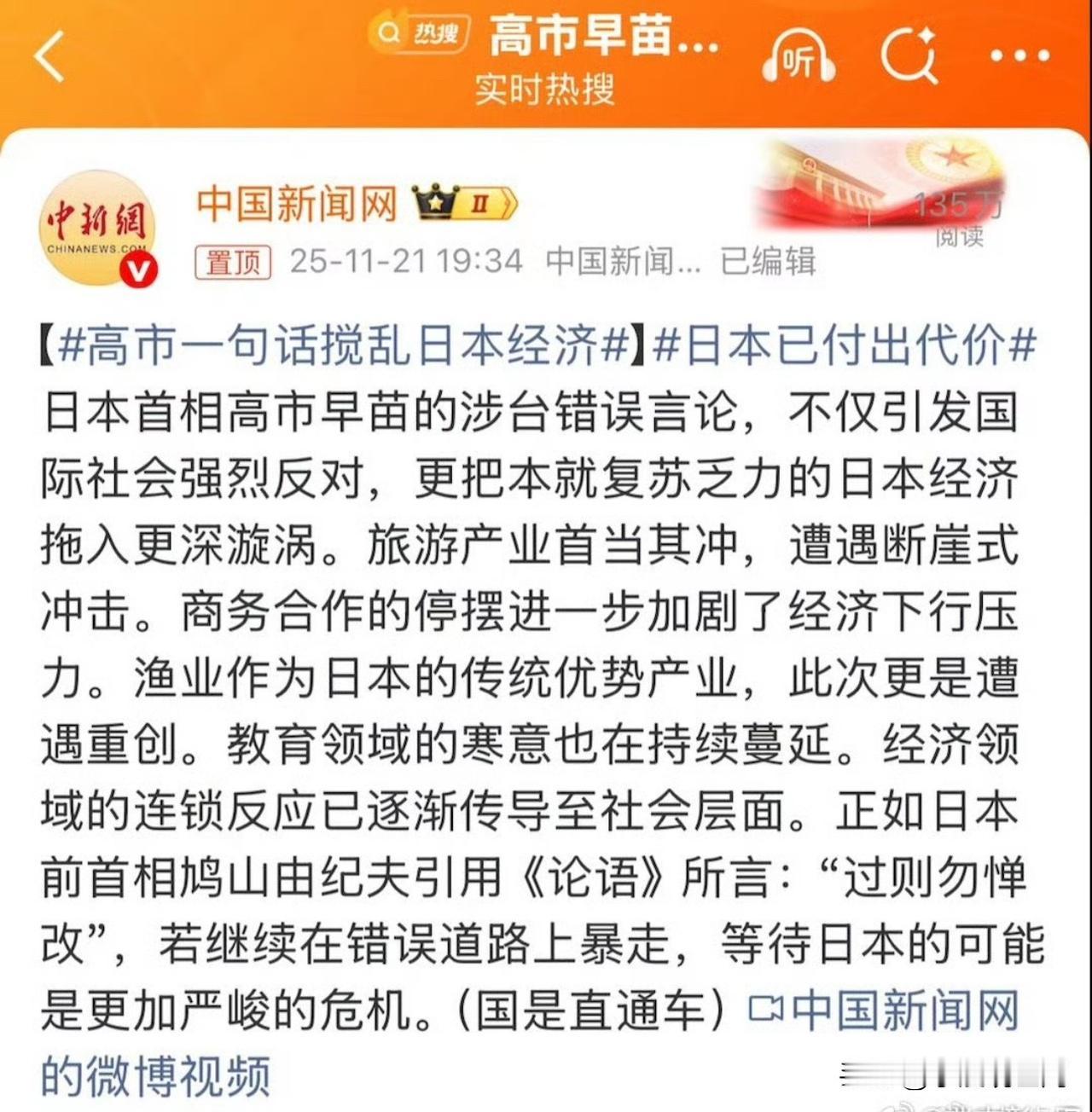 高市早苗女士,我们希望你能尽快对你发表的不当言论进行撤回并表达歉意。这件事已经发酵了半个月,对你来说已经损失惨重,日本民众也跟随你付出了惨痛的代价,经济大倒退、旅游业萧条、海鲜产品卖不出去、民众将看不到大熊猫了,你不要再硬撑了! 诚恳地向我们道个歉,把问题说清楚,这件事就能翻篇。请不要再继续回避下去了,及时纠正态度才是正确的选择。 若你迟迟不敢正面回应,中日大熊猫保护合作项目也可能因此受到影响,日本将再无大熊猫,这无疑是大家都不愿看到的。