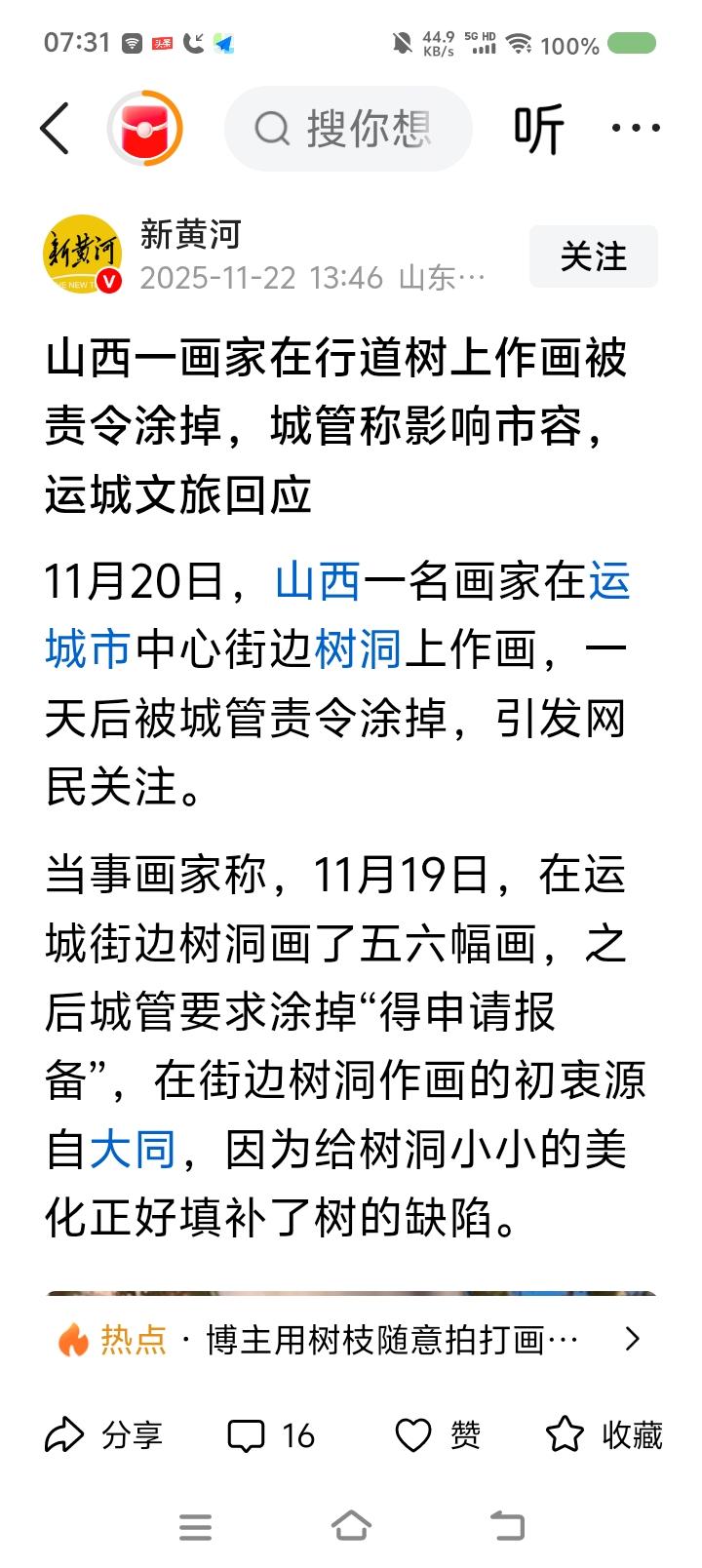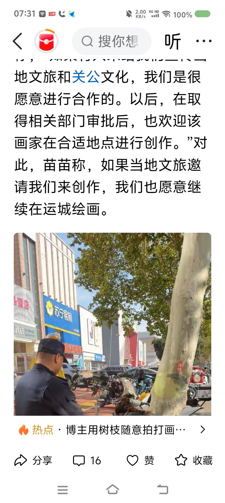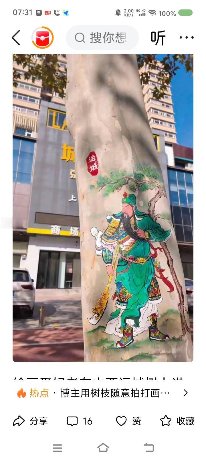 运城树上作画事件—— 据报道,近日,有人在运城市一棵树上作画,画的关羽,栩栩栩如生。有关部门让他恢复原貌,涂去作品。 点评: 此事引起争议。不少人支持画家:“人家说了,画画是为了支持运城文旅。再说了,画得挺好,为什么有关部门不能破例?”有人说:“不合法规,无法保留。” 我认为,这里面有个文化环境的问题。如果李白生活在当代,也无法墙上写诗山上题字。人终究爱限于社会和当下法律。 但如果你在荒废的村子墙上作画,即使不合法,也不算过分。在法之上,还有一个有分寸的情理。