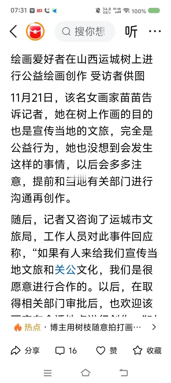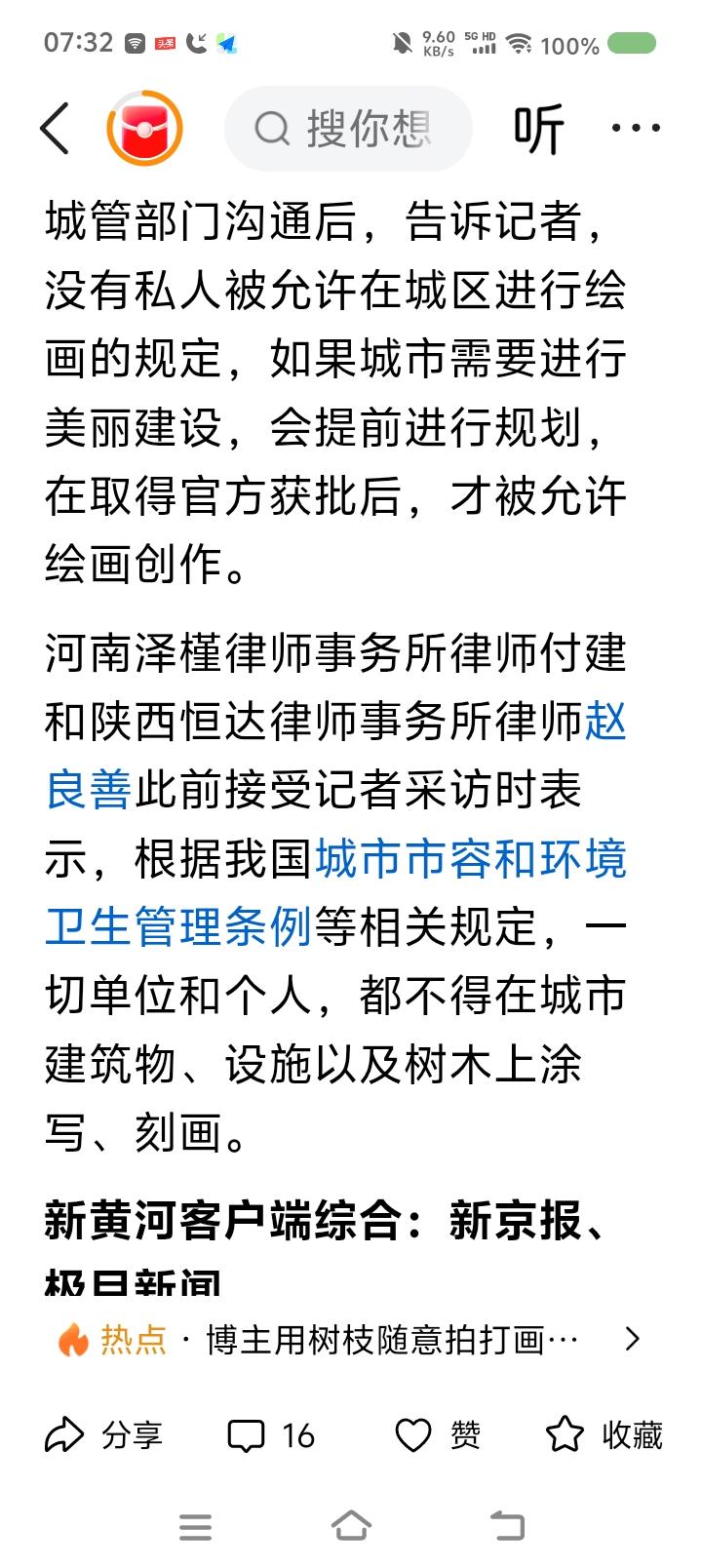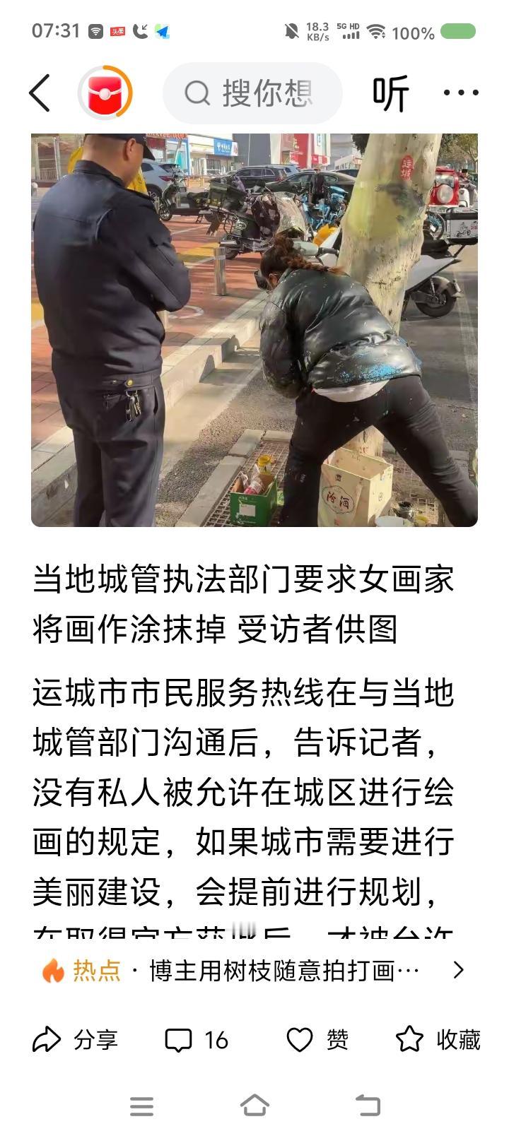 运城树上作画事件—— 据报道,近日,有人在运城市一棵树上作画,画的关羽,栩栩栩如生。有关部门让他恢复原貌,涂去作品。 点评: 此事引起争议。不少人支持画家:“人家说了,画画是为了支持运城文旅。再说了,画得挺好,为什么有关部门不能破例?”有人说:“不合法规,无法保留。” 我认为,这里面有个文化环境的问题。如果李白生活在当代,也无法墙上写诗山上题字。人终究爱限于社会和当下法律。 但如果你在荒废的村子墙上作画,即使不合法,也不算过分。在法之上,还有一个有分寸的情理。