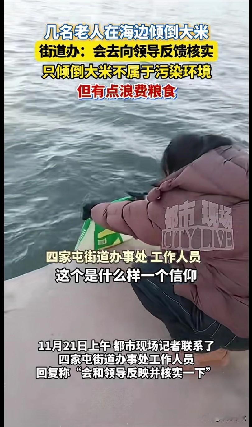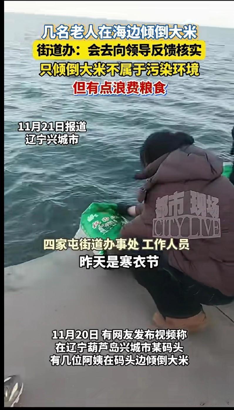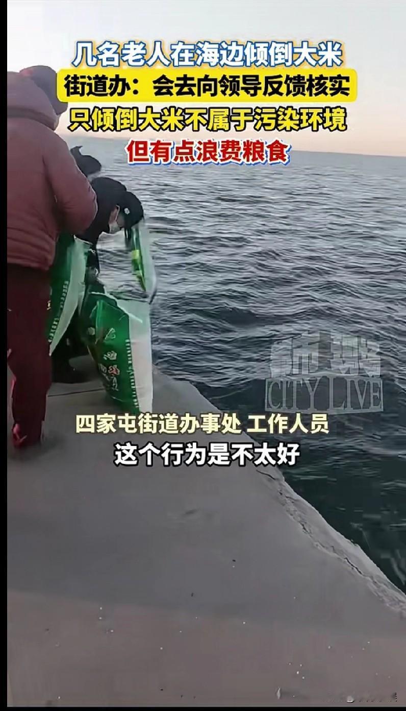 这两位老人是怎么想的,竟然往大海里倾倒大米,在视频中就可看到已经到了好几袋了。 当地有关部门表示,如果老人把包装袋扔进大大海,就算往大海里扔污染物,如果只是倒大米,大米算是粮食,不算污染物!! 虽然不算往大海里扔污染物,但是也太浪费粮食了吧,一下子倒了好几袋子粮食,太浪费了吧! 现在的生活条件好了,不像以前艰苦的日子了,生活富足了,但是也不能这么浪费啊! 这是有什么说法吗?这也不能是喂鱼啊,鱼又不吃生大米!不知道他们这是在干什么?
