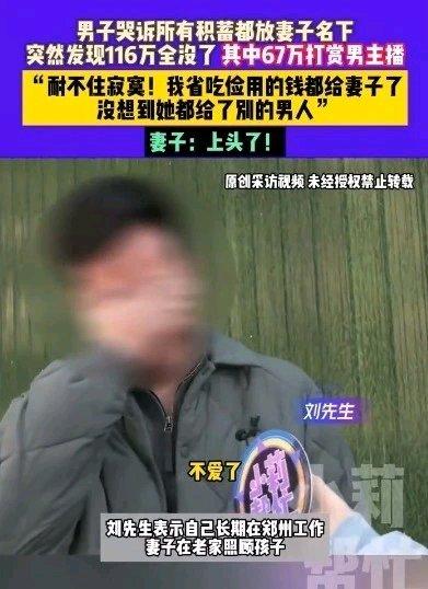 河南郑州这事儿太离谱了!刘先生和妻子结婚8年,自己在外省吃俭用,住300块一个月的房子,把钱都交给全职在家带娃的妻子保管,8年攒了116万定期存款。可倒好,再三逼问下发现钱全没了,67万打赏给男主播,剩下的妻子也说不清楚,还欠了8万多网贷。刘先生哭得那叫一个伤心。他妻子说就是上头了,想给对方拉票打PK。这直播的魅力也太大了,把人迷得连家庭积蓄都不顾了。目前刘先生已向平台反映,就看后续怎么处理这夫妻共同财产的事儿了。