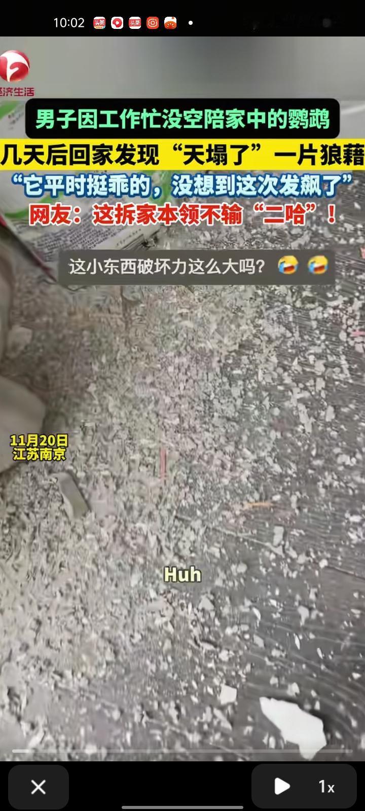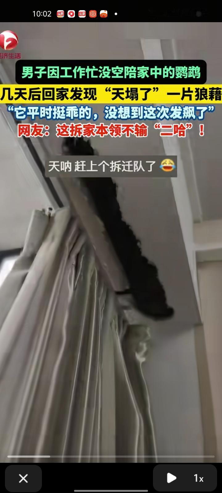 11月20日,江苏南京。网友发视频称,因为忙工作无暇陪家里的鹦鹉,回家一看天塌了,洗衣机旁边掉落下碎屑,天花板被鹦鹉凿出洞。这只小鹦鹉养了一年多,平常自己每天陪它玩一会,没想到这次鹦鹉发飙了。