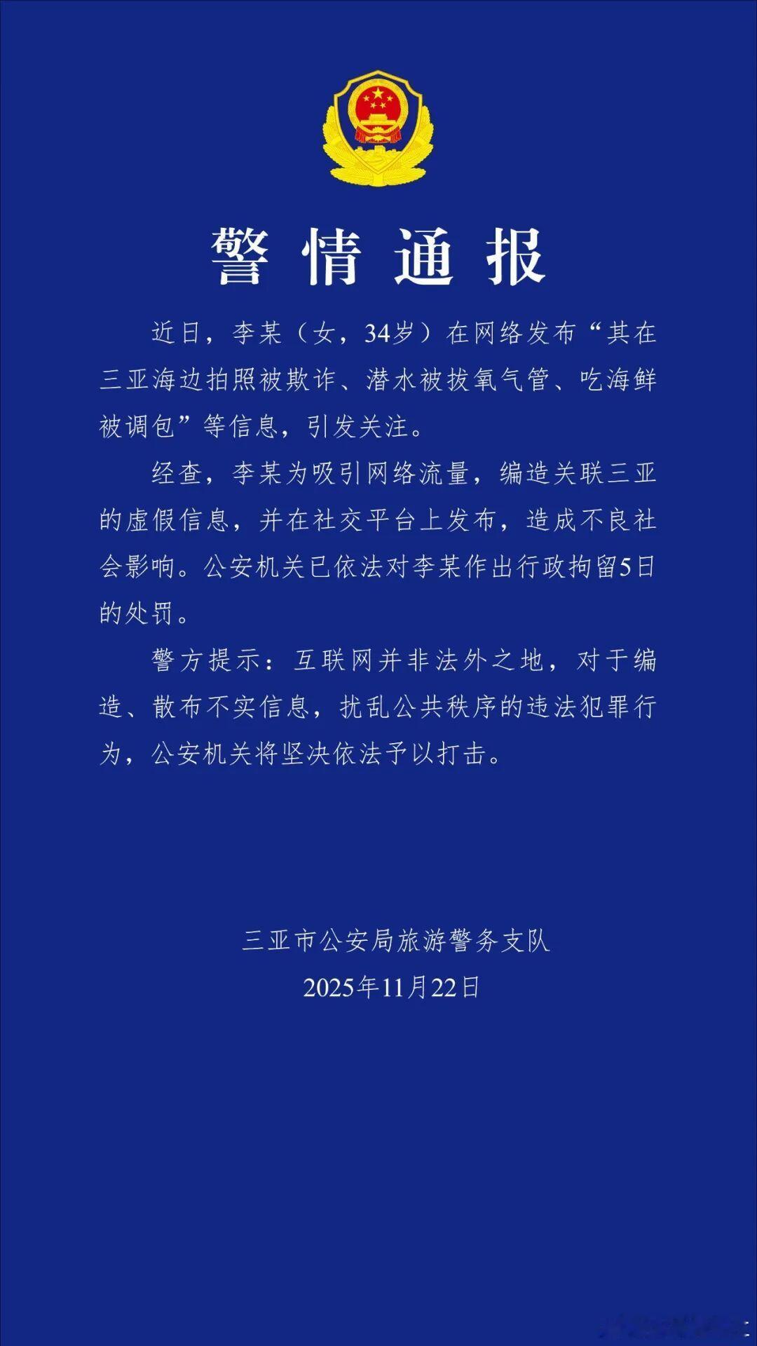 李某(女,34岁)在网络发布“其在三亚海边拍照被欺诈、潜水被拔氧气管、吃海鲜被调包”等信息,引发关注。