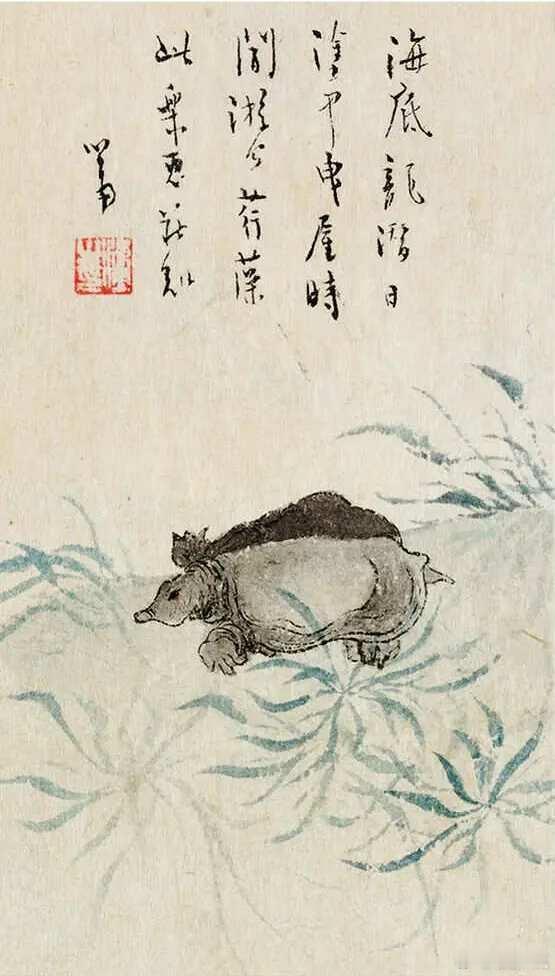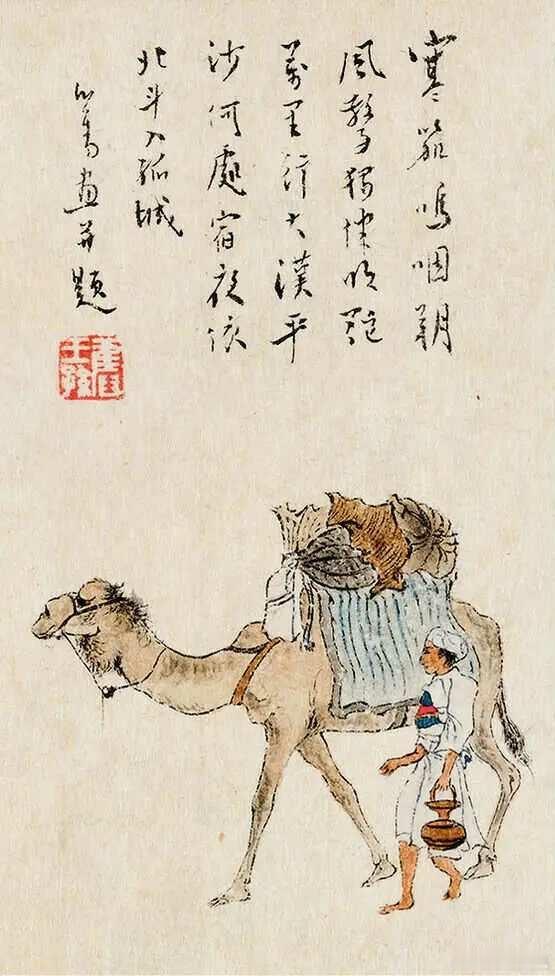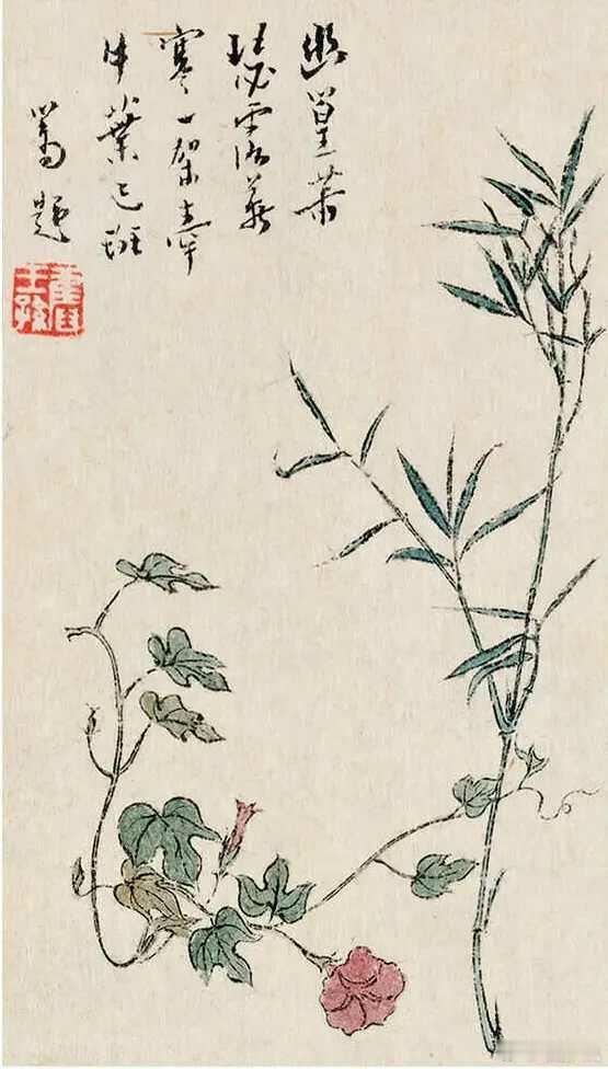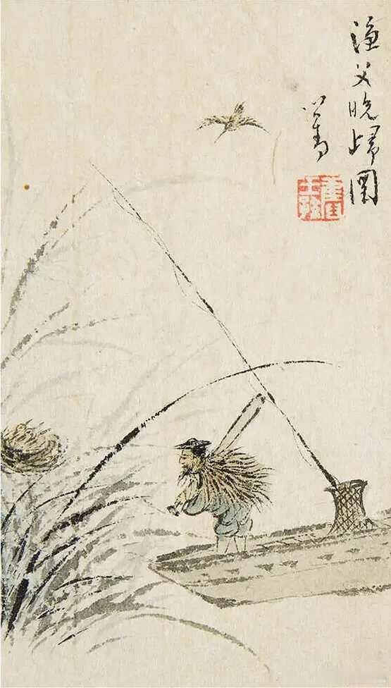 溥心畬《天趣清晖册》,册页(八开) 设色洒金笺。11.5×6.5 cm, 约0.1平尺(每幅)。描绘柳边秋引、大漠平沙、自在江湖乐、闲游分荇藻、一架牵牛、高藤垂饮猿、渔父晚归、枫林已无叶等八开诗意,人物、动物、花卉、山水,文人悠闲自得的逸趣洋溢笔端。