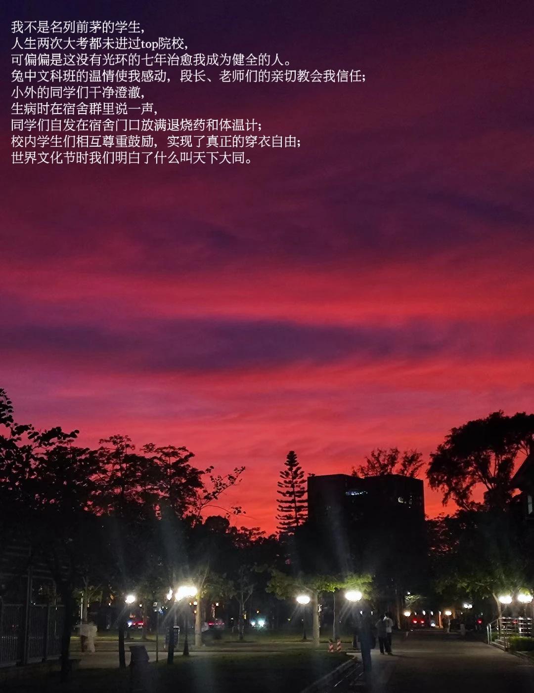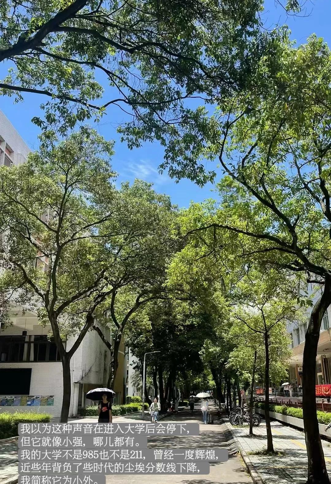 那些瞧不起母校的人都在想什么? 自从上高中起,唱衰母校似乎成为部分同学的时尚单品。 “兔中?兔中不是十八类校吗?” 我的高中不算当地名列前茅,在人们称的老八所中排名第八。自从我进去起,即使我兔没得罪任何人,以兔中为耻都成为一些同学可以随时把玩的梗。 “都来兔中了,你以为自己能考多好,我觉得自己都完了。”有人觉得来了兔中前途一片灰暗,仿佛中考不是自己考来的。 “我可是差0.5分就能去A中,来兔中我真是服了。”有人总觉得自己是当代妙玉、名校遗珠,不得已美玉落淤泥。 我以为这种声音在进入大学后会停下,但它就像小强,哪儿都有。 我的大学不是985也不是211,曾经一度辉煌,近些年背负了些时代的尘埃分数线下降,我简称它为小外。 “出租车司机问我小外是中专还是大专啊?是本科吗?哈哈小外你现在就是个专科你懂吗。辛辛苦苦十八年考来就这?” 看到这条朋友圈,我心想真是恰似故人来。 回想自己高中到大学的七年,我经历了兔中110年校庆和今天小外的60周年校庆。我转发校庆视频到pyq,不一会收到一条信息。 “看来你对母校挺有感情的,我对我的都恨不得撇清关系。” 我一时庆幸你不是我校的学生,一时为你校感到难过,这份缠绕我许久的疑惑也在此刻被推到顶峰: 那些瞧不起母校的人都在想什么? 我不是名列前茅的学生,人生两次大考都未进过top院校,可偏偏是这没有光环的七年治愈我成为健全的人。 兔中文科班的温情使我感动,段长、老师们的亲切教会我信任;小外的同学们干净澄澈,生病时在宿舍群里说一声,同学们自发在宿舍门口放满退烧药和体温计;校内学生们相互尊重鼓励,实现了真正的穿衣自由;世界文化节时我们明白了什么叫天下大同。 “你们兔中也很厉害呀。” “小外确实很有实力。” 七年遇到各种各样的人,我总能听到这些话。人是环境的产物,我不否认母校们的局限与神操作,可我真的在这里遇到好多发光的人、经历许多难忘的事。我看到学弟通过自己的努力创下兔中高考又一高分,见证学长从小外走向联合guo。 我的母校们从未许诺我一个完美的温室,却给了我一片足以练习飞翔和期望未来的天空,它那永远哺育青春的土地,使我成为“富有且慷慨”的人。 一年又一年,终于轮到我为青春画下句号。可这每一份的平台与机遇,我都有荣与焉。 广外,六十周年生日快乐。 母校 随笔 大学 高中