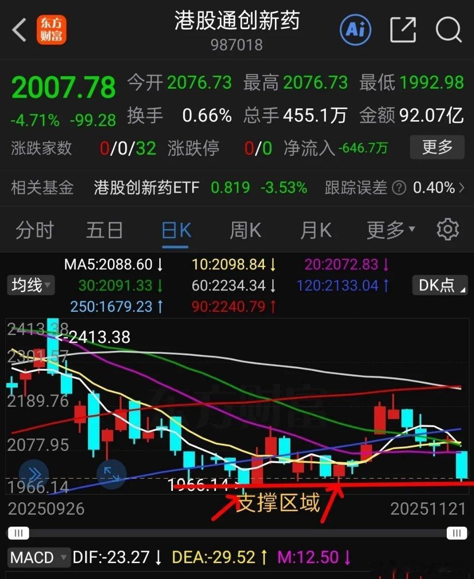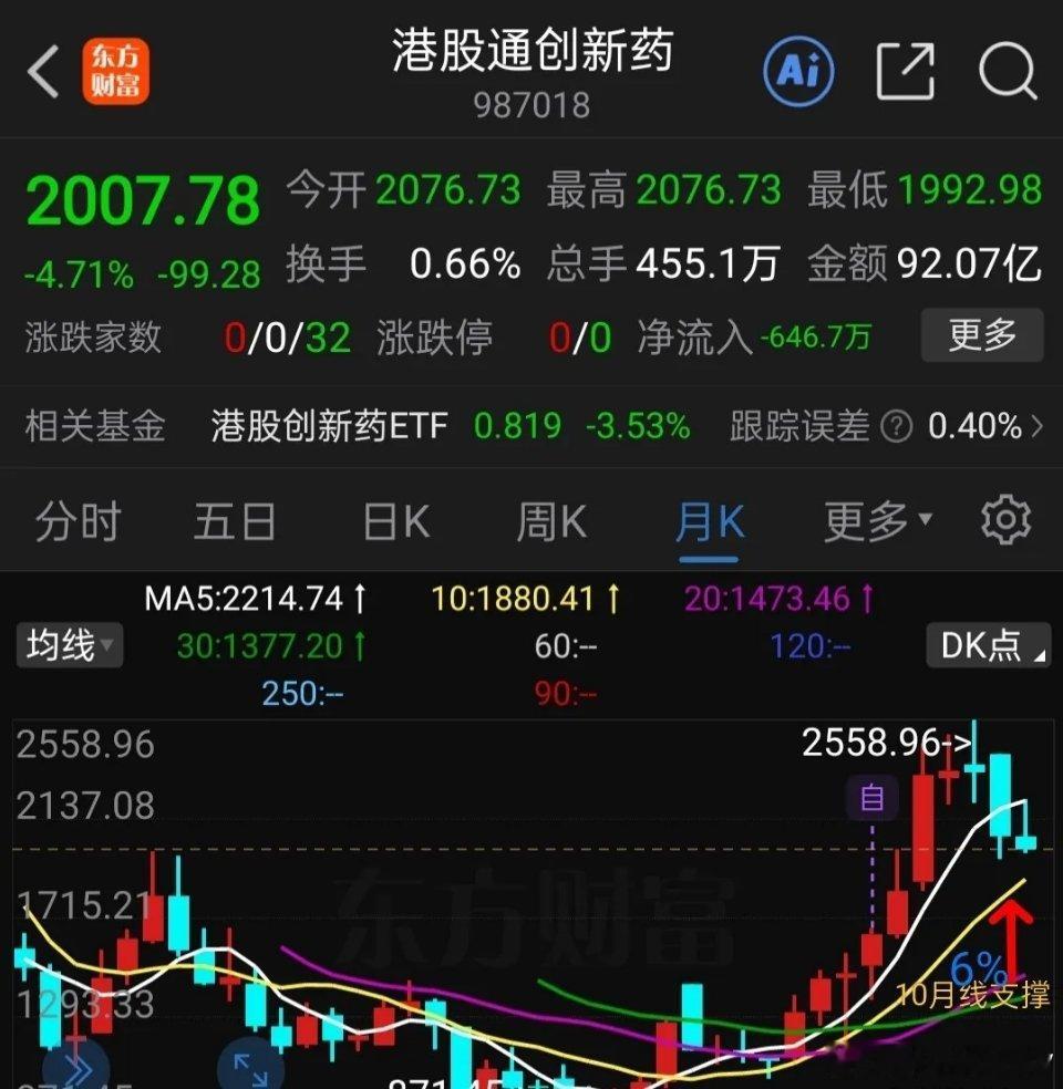 港股通创新药弱势难改,下周大概率震荡整理,10月线成关键考验港股通创新药近期走势疲软,周五大幅下挫后,再度回落至前期低点支撑区域,短期大概率在此区间展开横盘筑底;但若后续遭遇利空冲击,该支撑位恐难以坚守。周线层面,板块已跌破坚守5周的30周线支撑位,这一关键均线的失守进一步弱化了技术面形态,下周能否重新收回30周线,将成为短期趋势能否修复的重要信号。月线维度的压力更为明显:指数已跌破5月线支撑,当前距离下方10月线仅约6%的空间,后市回踩10月线的概率极高。除非板块持续震荡整理,等待12月10月线逐步上移至1970点附近形成共振支撑,或直接启动反弹扭转下跌趋势,否则弱势格局难有实质性改变。综上,港股通创新药当前处于明确的趋势下跌中,板块表现偏弱,下周大概率延续震荡整理行情。操作上建议:若横盘整理且支撑有效,可择机低吸布局;若出现破位下跌走势,则以观望为主,避免盲目抄底。