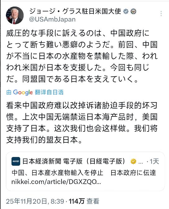 美国驻日本大使乔治·格拉斯(11月20日)发文写道:“看来中国政府难以改掉诉诸胁迫手段的坏习惯。上次中国无端禁运日本海产品时,美国支持了日本。这次我们也会这样做。我们将支持我们的盟友日本。” 中国对日本海产品的那些管制措施,从来就不是 “没道理”,更谈不上什么 “胁迫”—— 从头到尾,都是为了守住 14 亿人的食品安全和健康,是没办法才做的必要动作。 这事得从 2023 年 8 月 24 号那天说起,日本政府当时不管国际社会怎么反对,铁了心要把福岛的核污染水往海里排。 大家可能不知道,那核污染水里藏着 60 多种放射性物质,像碘 129、铯 137 这些都在里面,尤其是碳 14,它的半衰期能到 5730 年。 这可不是短期能消失的东西,会跟着海洋生物的食物链一层一层攒起来,比如小鱼吃浮游生物,大鱼吃小鱼,最后这些放射性物质很可能就通过海鲜跑到人的身体里,对健康造成威胁。 就为了守住老百姓的餐桌,中国海关总署当天就发了公告,全面暂停进口所有日本水产品,这一停,就快两年时间。 直到 2025 年 6 月,这事才有点转机。中国这边没闲着,一直盯着日本非高风险地区的水产品做监测和科学评估,最后发现部分地区的产品没检出异常; 加上日本那边也承诺,会严格管着自家水产,还会提供完整的安全检测材料,中国这才松口,说 “可以有条件恢复进口”。 但这 “有条件” 可不是随便说说的:像福岛、宫城这些高风险的 10 个都县,还是彻底不让进; 想往中国运货的日本水产企业,得重新办注册手续,审核过了才能干; 每一批货都得带齐三样证明 —— 卫生证书、放射性检测合格报告、还有产区证明,少一样都不行;而且中国海关还得开箱抽检,只要查出一点问题,这批次货就别想过关。 本以为中日水产贸易能慢慢回暖,可没成想,刚有点好转就又出了岔子。11 月 7 号的时候,还有 6 吨日本扇贝运到中国,结果才过 12 天,中国就又发了暂停进口的通知。 这波 “反转” 可不是中国故意的,全是因为日方没守信用,犯了两个关键错误。 外交部发言人毛宁在记者会上把这事说得很明白:一方面,日方当初答应得好好的,要提供足够的技术材料证明产品安全,可中方催了好几次,他们要么支支吾吾,要么拿不出像样的东西。 这就跟咱们平时买东西一样,商家拍着胸脯说 “我这东西绝对安全”,可真让他拿检测报告,他就掏不出来 —— 换谁也不敢买啊? 食品安全这事儿,尤其是沾了核污染的水产品,哪怕只有万分之一的风险,也不能拿老百姓的健康赌。 另一方面,日本首相高市早苗还在台湾问题上扯了不该扯的话,明摆着挑衅中国的主权,这事儿让中国老百姓特别生气。就算那些日本海鲜真的合格,大家也不愿意买带着政治挑衅味儿的东西,心里膈应。 再说说美国所谓的 “支持”,这才叫有意思 —— 嘴上喊得比谁都响,实际做的却是另一套。 之前美国前驻日大使伊曼纽尔还喊着要帮驻日美军买日本海鲜,说中国的禁令是 “经济战争”,结果真买的时候,扇贝连一吨都没凑够。 要知道,以前中国光一年进口日本扇贝就超过 10 万吨,这点量给日本堆得像山一样的库存塞牙缝都不够。 更讽刺的是,今年上半年,美国是减少进口日本农林水产品最多的国家 —— 像日本酒、鱼糜,还有那些主产地在核污染影响区的扇贝,美国自己先躲得远远的,生怕沾一点。 这种 “中国不能禁,但我们可以少买,而且中国还得放开” 的逻辑,谁听了不觉得荒唐? 而且不光中国,俄罗斯这些国家也都对日本水产品设了进口限制 —— 这说明面对日本核污染水排海,各国采取预防措施是很正常的,是国际社会的普遍做法。 中国的这些措施,完全是按国际法和国际惯例来的,依据的是《食品安全法》和 WTO 的 SPS 协定,本质上就是基于科学的预防手段:既对自己国家的人负责,也是在逼着日方好好履行责任,别拿核污染水不当回事。 可再看看美国,他们自己天天拿食品安全当借口,限制其他国家的产品 —— 比如对欧洲的农产品设各种门槛,对中国的水产品搞不合理的检疫。 到了中国这里,就随便扣上 “胁迫” 的帽子,这双标玩得也太明显了。 从数据上也能看明白真相:2022 年的时候,日本对华水产品出口还能有 871 亿日元,到 2024 年直接跌到 61 亿日元;占比也从 22% 掉成了 2%。 北海道那边,3000 吨扇贝堆在那儿卖不出去,青森的海胆只能低价甩卖,零售价一下跌了 40%—— 这些都不是中国的问题,是日本自己要排核污染水,还在政治上挑衅中国才导致的。 更何况,2024 年中国从日本进口的水产品,只占中国水产总进口额的 0.1%,就算彻底暂停,国内市场也不会缺海鲜。