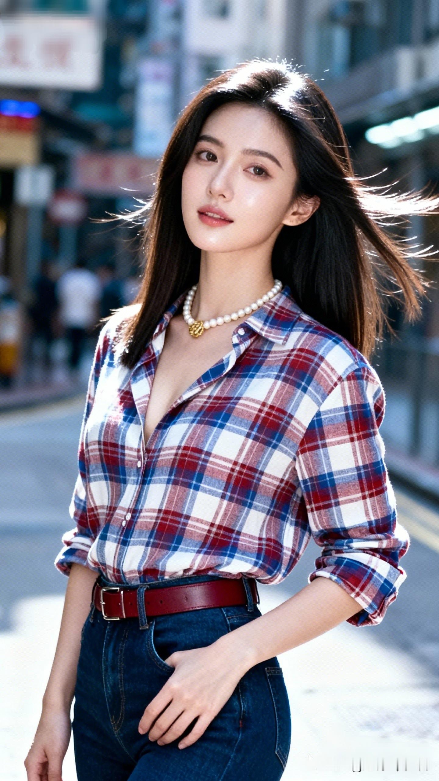 红袖添香夜,月色照人归。清秀的女孩子是什么样子的 都市时尚少女,红白蓝格子衬衫搭配珍珠项链,街拍凹造型,元气满满!