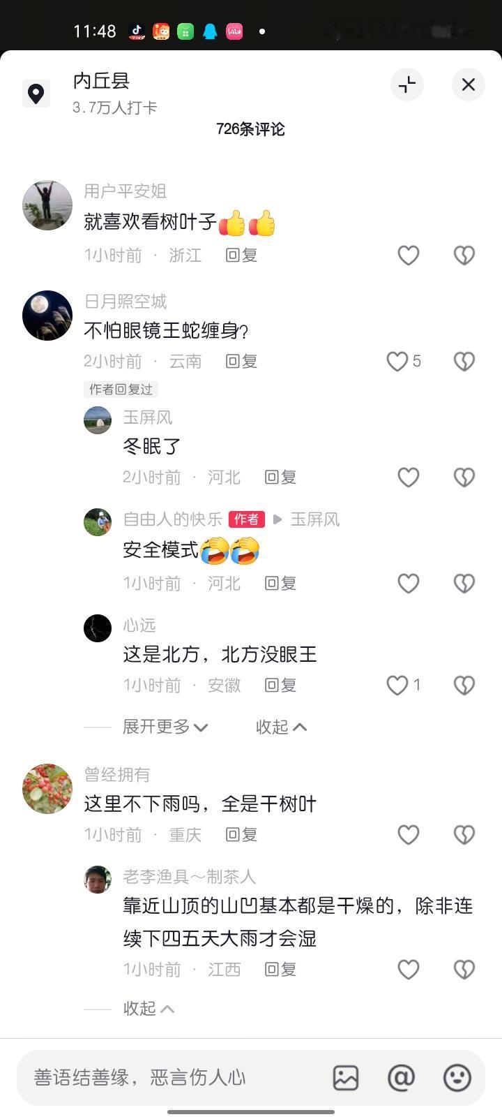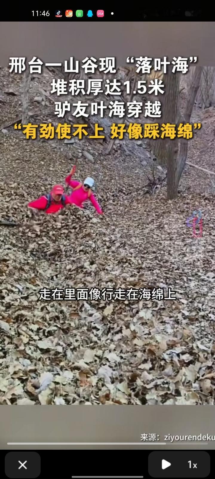 11月22日,邢台市内丘县。驴友穿越时发现“落叶海”,落叶堆积厚达1.5米,应该是大风刮来的。走在里面犹如行走在海绵上,有劲也使不上,很有意思。对于网友担心里面有没有蛇的问题,视频拍摄者回应称很安全。