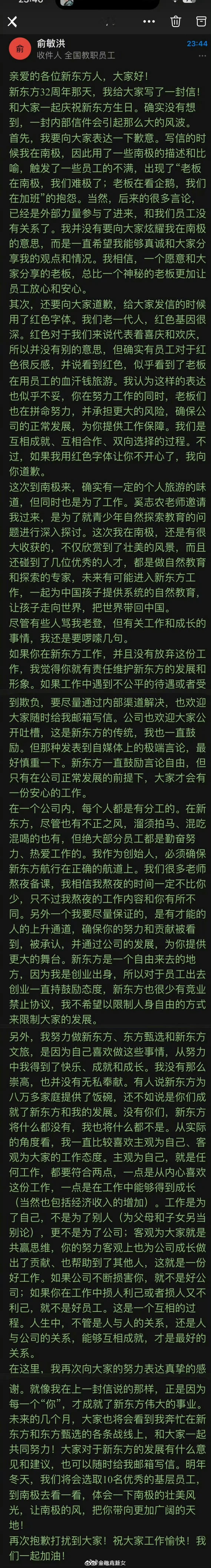 平心而论,俞敏洪的两封全员信在十几年前可能没啥问题,但现在写这种东西几乎很难得到