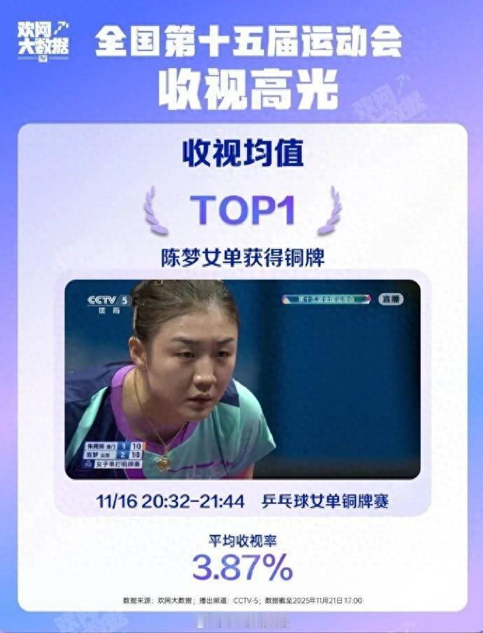 万万没想到!全运会收视率第一的,不是孙颖莎和王曼昱的女单冠军赛,也不是樊振东和王楚钦的男单冠军赛,而是陈梦的女单铜牌赛。 陈梦和朱雨玲的女单铜牌赛,以3.87%的平均收视率成为“收视均值TOP1”焦点,其实这也是可以理解的,陈梦是31岁的乒坛老将了,手握两枚奥运金牌,五战全运会,本来就是个传奇。 其比赛对手朱雨玲又是自己的十年老友,曾经病退又复出参加比赛,这场比赛体现的不仅仅是竞赛,还体现了对体育运动的坚持与热爱,体现了顽强的拼搏精神,这比金牌更让人动容。 在赛场上,每一个努力的人,每一个为梦想而拼搏的人,都值得尊重,都值得我们大家为其鼓掌!