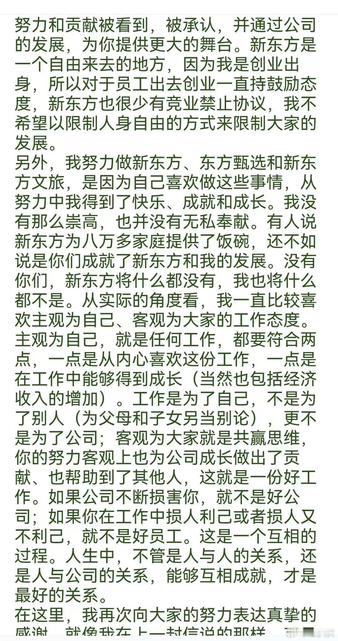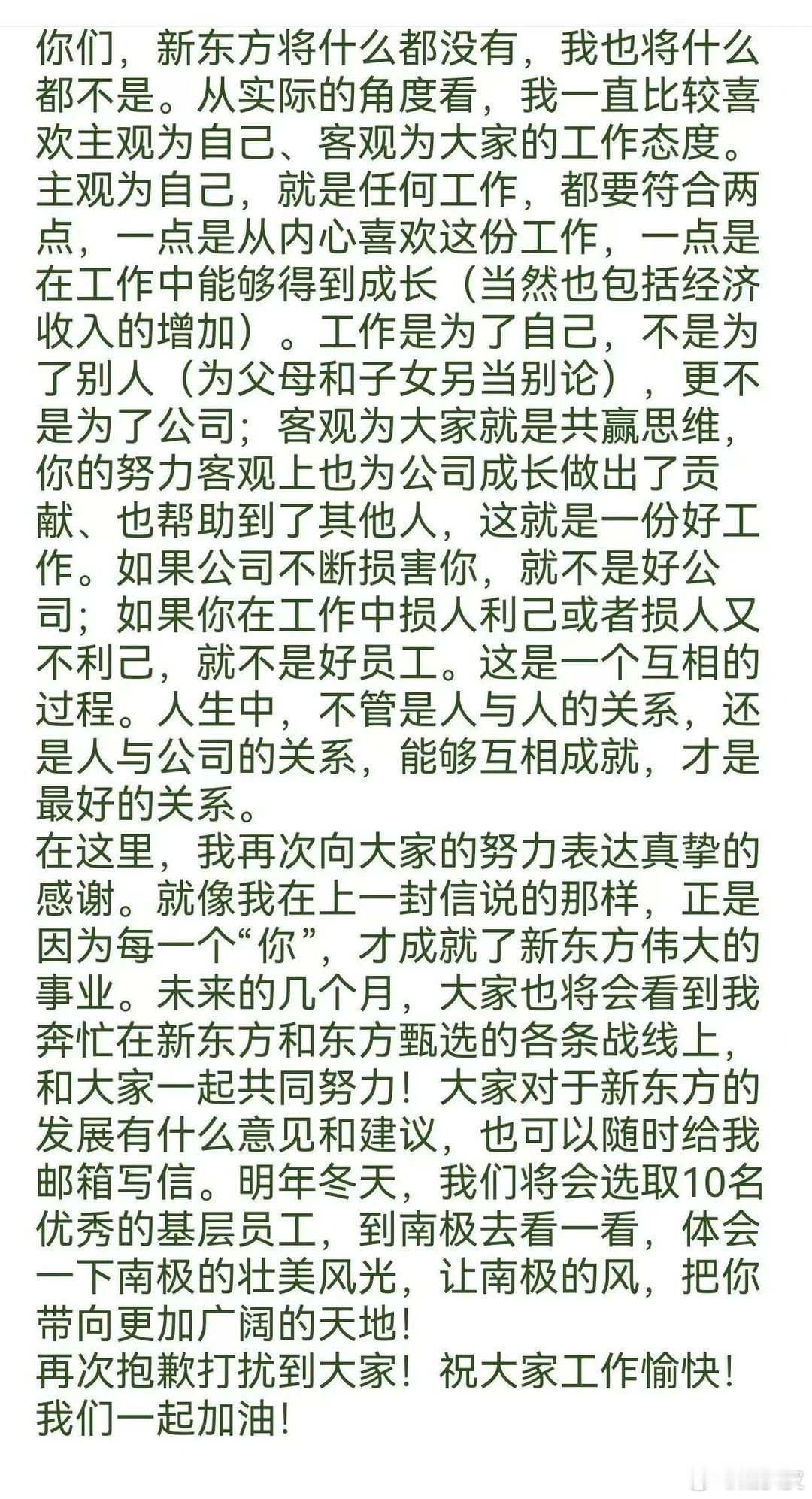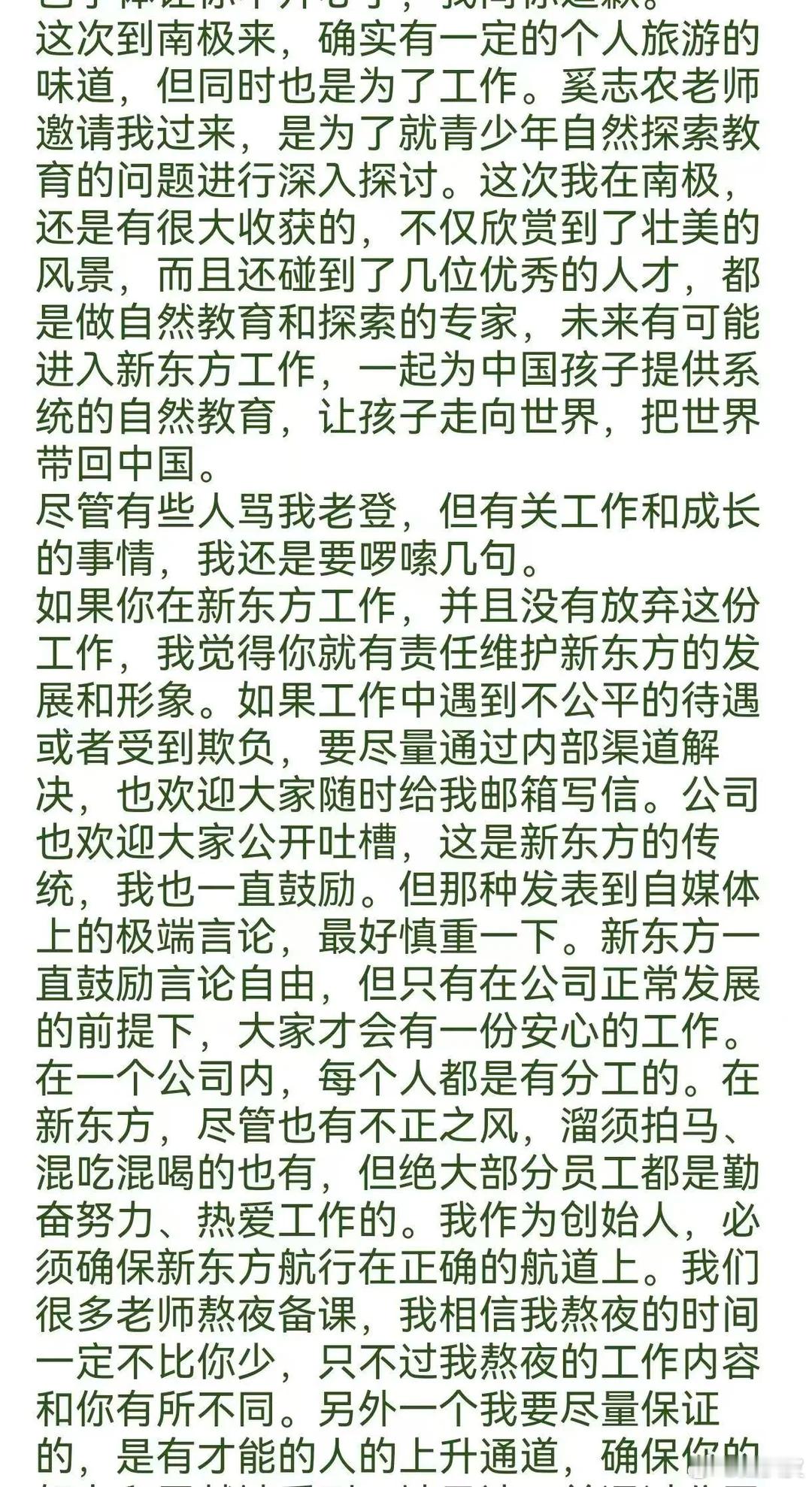 俞敏洪又又写全员信了。这次用绿色字体如果真有员工因为一个南极邮件产生什么离职想法,就太极端了。吐槽领导是员工的本能,我甚至觉得不用道歉,但是俞老师总的来说算是一个有担当的“资本家”。