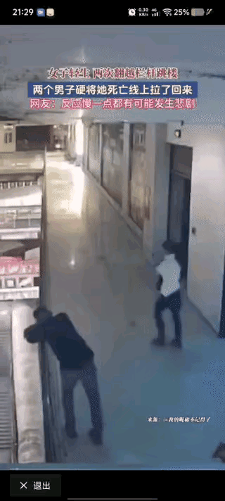 这真是想自杀啊, 动作一点不拖沓, 不带一丝犹豫, 一位女子径直走到围栏前, 跨上围栏就准备跳下去, 多亏一男子上前把她拽了下来, 后来又来了一位男子把她连拉带劝的带离了栏杆, 没想到女子又趁着两人不注意跳下栏杆, 这回她整个人身体都在栏杆外, 这两位男子又是拼命的拽住她, 简直惊险万分, 稍微有一个手滑, 女子可能就掉下去没命了, 可想而知当时是多么的惊险, 如果女子没被救上来, 两位男子的心里阴影该有多大, 希望女子好好珍惜生命, 不辜负两位好心人的奋力相救, 死都不怕,还怕活着吗?