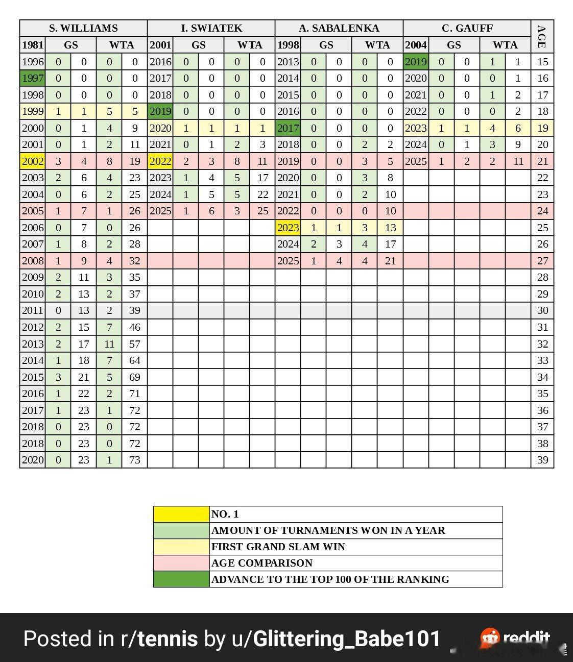 小威和斯瓦泰克、萨巴伦卡、高芙每一年拿到的大满贯、WTA冠军数对比你们觉得未来谁能最接近小威的成就?