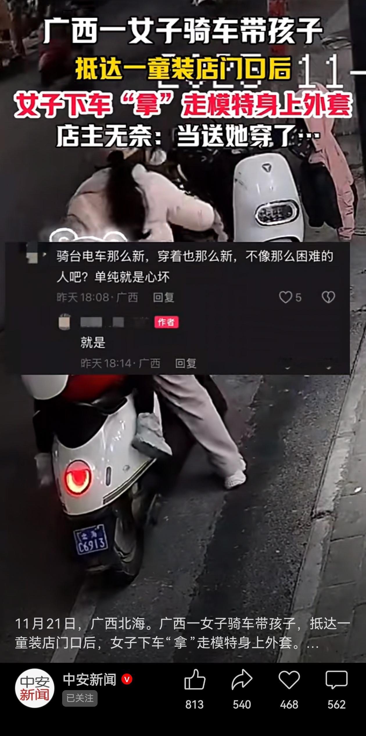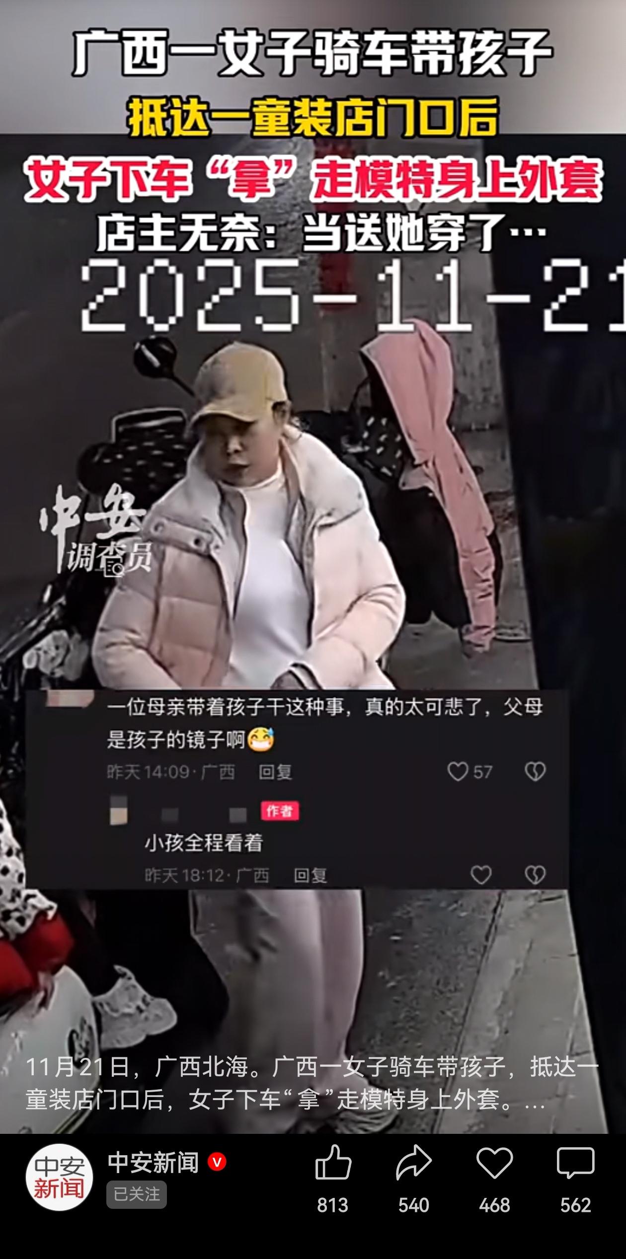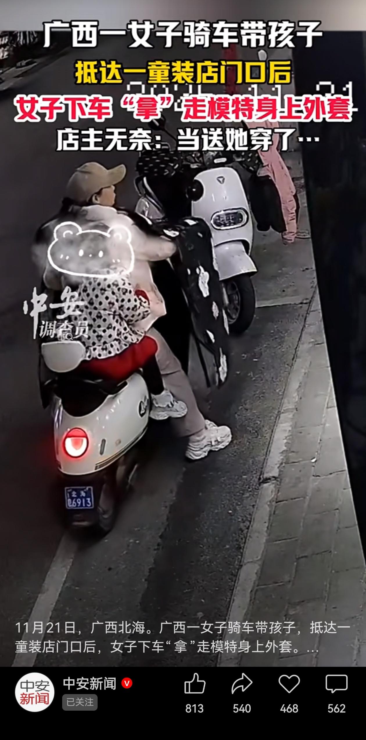 心疼小姑娘!11月21日,广西北海一家童装店门口,模特儿身上穿的新衣丢了。 老板一查监控,清晰看见一位大姐,骑着电瓶车带着孩子,路过童装店时,淡定下车,直接从模特身上扒了外套,卷吧卷吧塞到车前面,骑车一溜烟,走了! 全程行云流水,好像拿自己家衣服一样坦然,完全没有第一次作案该有的“小心翼翼”? 店主看了监控视频后,也只能苦笑着说“当送她穿了”。不是不想追究,是这件小孩外套价值不高,找人又像大海捞针,维权成本太高,只能吃这个哑巴亏。 最心疼的是坐在后座的女儿!小姑娘安安静静坐在后座上,亲眼看着妈妈完成这场“顺手牵羊”。她或许还不明白这叫偷窃,但妈妈这个理直气壮的举动,已经像烙印一样刻在她小小的心里了吧? 这位妈妈可能没意识到,她顺走了一件几百块的衣服,可是已经在孩子心里悄悄埋下了一颗什么种子啊? 当孩子长大后真正明白对错的那天,回想起童年这一幕,该有多失望?用一件衣服的代价,换走孩子心里的光,这笔账真的划算吗? 以为捡了芝麻,其实丢了西瓜而不自知! 信息来源:中安新闻