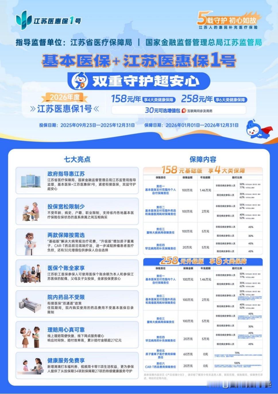 给您提个醒:百来块的江苏医惠保1号,关键时能保 今天必须给大家唠唠江苏医惠保1号,这真的是实实在在为咱江苏老百姓着想的好保险! 我家孩子去年突然得了一场大病,直接住进了重症监护室。每天看着费用清单,心都在滴血,那钱就像流水一样。虽说医保报销了一部分,可剩下的费用对我们普通家庭来说,依旧是天文数字,到处借钱的日子真的太难熬了。 幸运的是,我之前就给全家买了江苏医惠保1号。提交理赔申请没几天,理赔款就到账了,一下缓解了我们家的经济危机。有了这笔钱,孩子后续的治疗也有了保障,我们当父母的心里也踏实多了。 江苏医惠保1号是政府指导的,只要是江苏有医保的人都能买,不限年龄、职业,有既往病史也能保能赔,真的很友好。而且现在家庭参保免赔额更低,对咱们普通家庭来说,性价比超高! 真心建议江苏的朋友们,都给家人安排上江苏医惠保1号,一年也就一百来块钱,却能给全家一份安心保障,别等生病要用钱了才后悔没买!